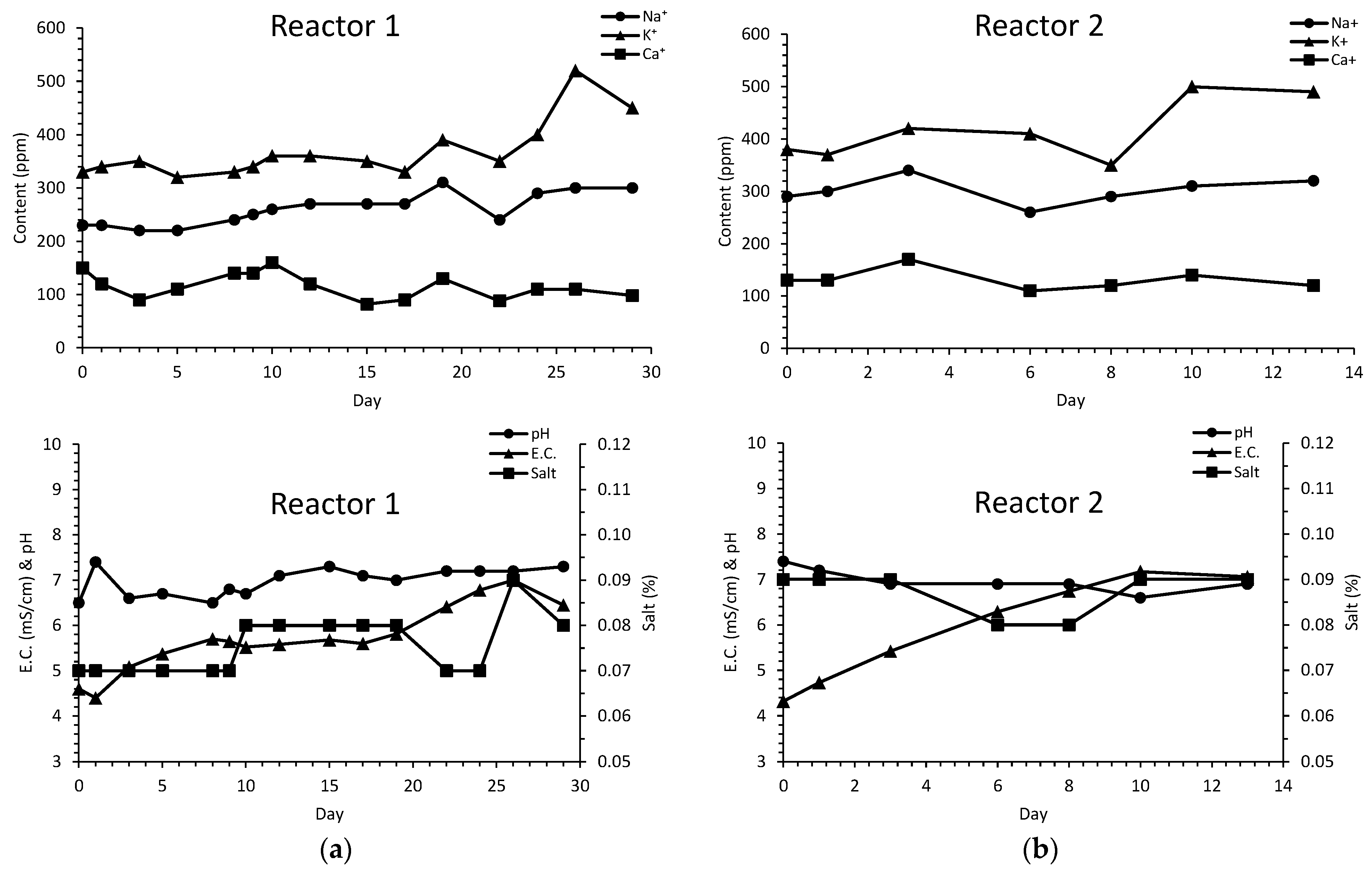 - Pandey, P.K.; Ndegwa, P.M.; Soupir, M.L.; Alldredge, J.R.; Pitts, M.J. Efficacies of inocula on the startup of anaerobic reactors treating dairy manure under stirred and unstirred conditions. Biomass Bioenergy 2011, 35, 2705–2720. [Google Scholar] [CrossRef]