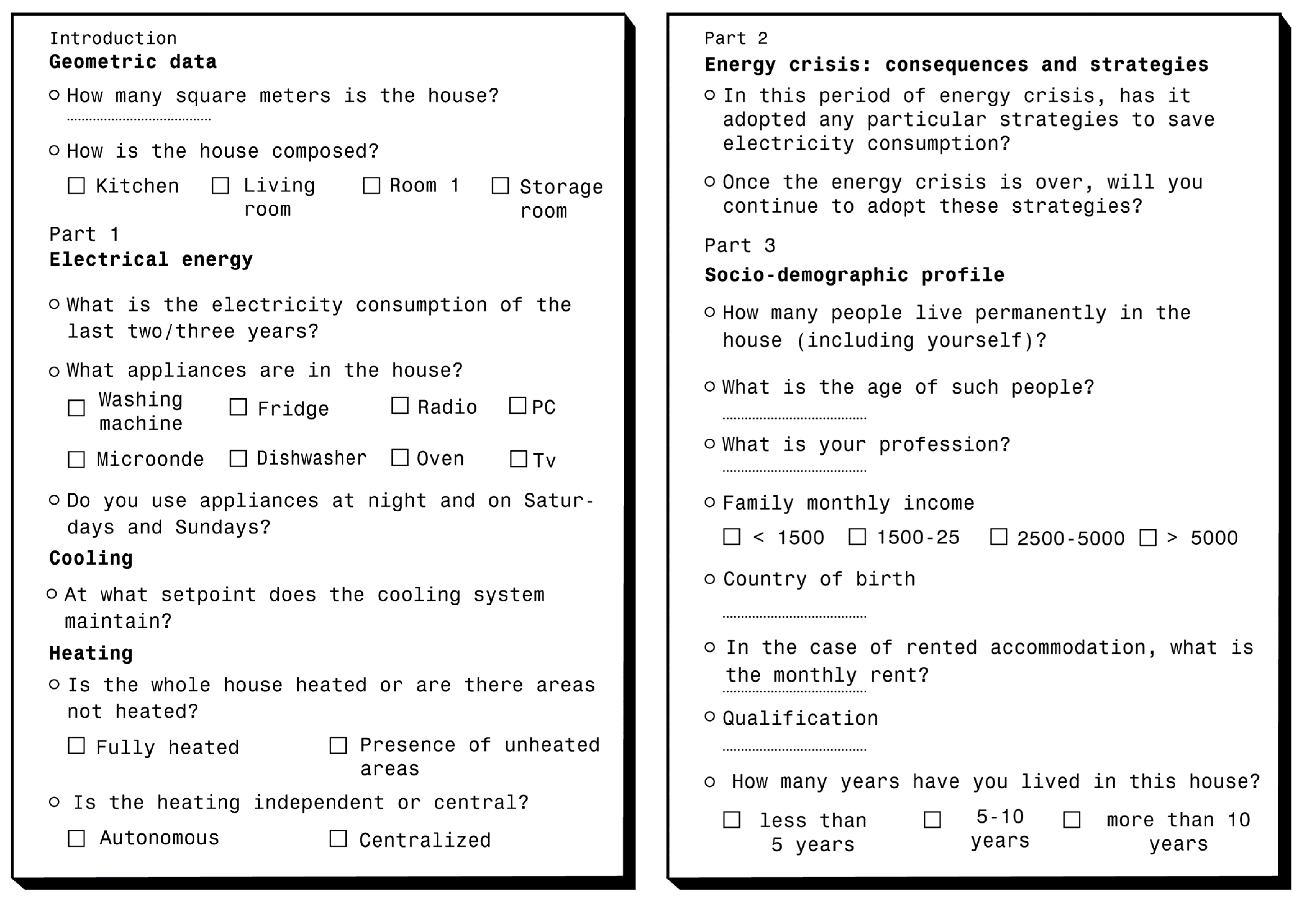 The methodology adopted in this study relies on a direct field approach aimed at collecting reliable and multidimensional data on EP at the building scale. It integrates information on the architectural and physical features of dwellings, household energy consumption and technical systems, together with socio-economic characteristics such as family composition, income, and household size.