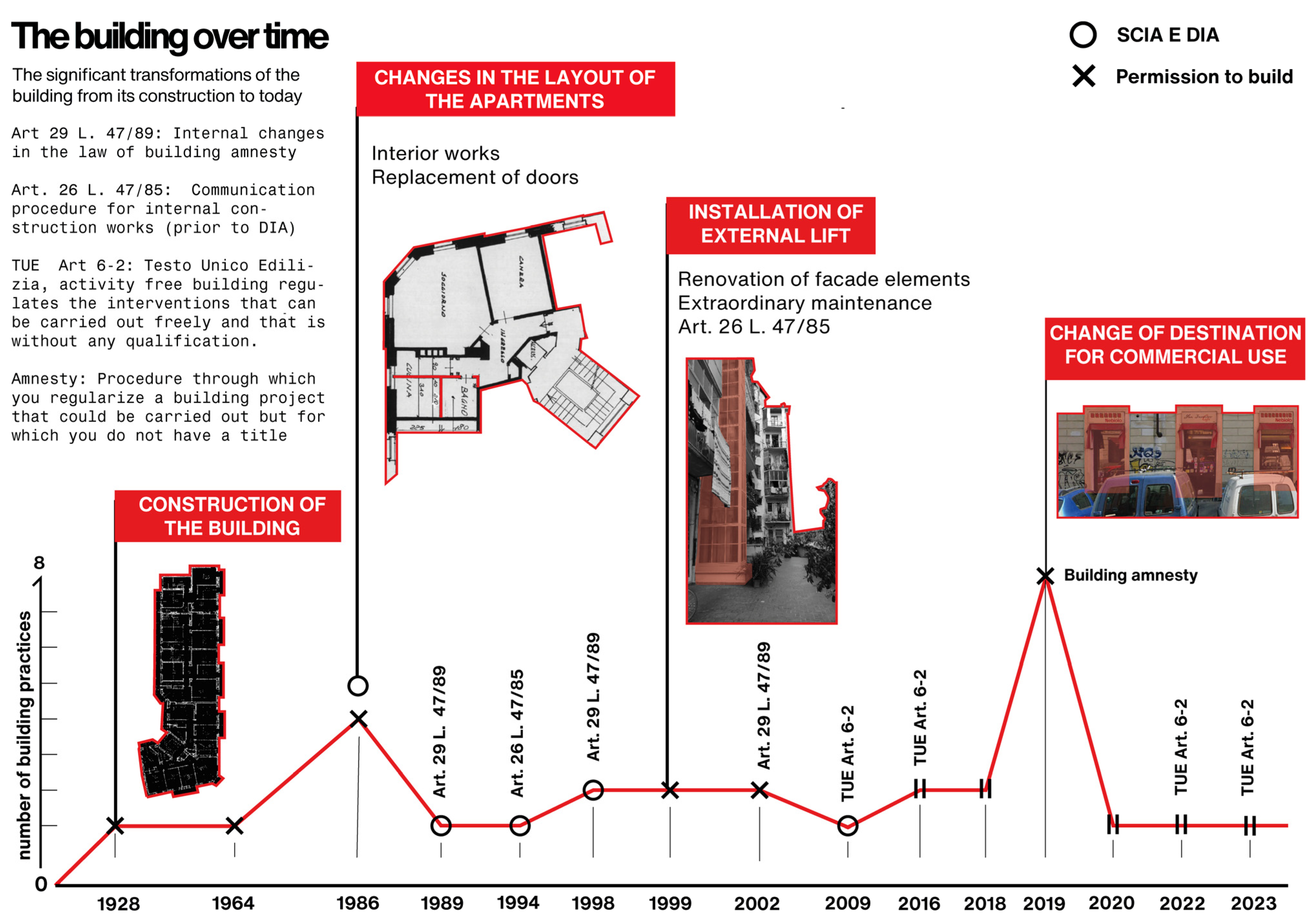 Figure 5, which presents the timeline of modifications. Importantly, the historical analysis revealed that no energy retrofitting interventions have ever been carried out. This strongly suggests that the building still performs with very limited energy efficiency, in line with its original construction characteristics.