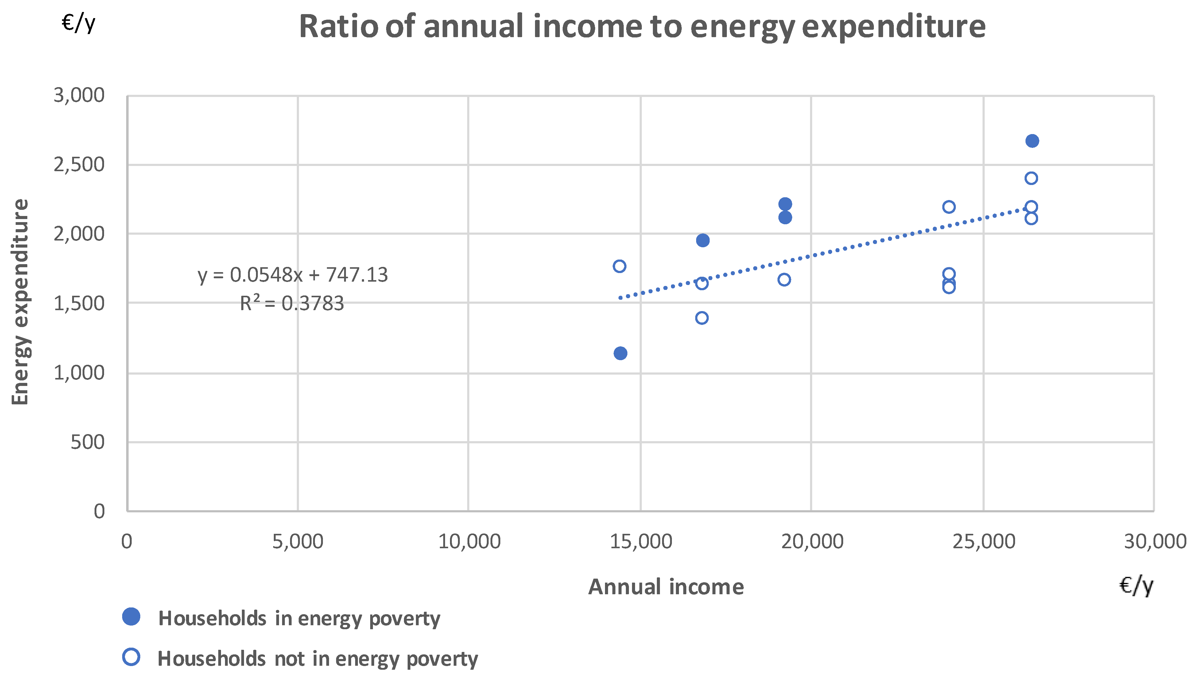 2 = 0.38), indicating that higher-income households generally spend more on energy. However, the blue dots representing households in EP consistently lie above the regression line, meaning that their energy expenditure represents a disproportionate burden relative to their available income. This result confirms that absolute expenditure levels alone are not sufficient to identify vulnerable households.