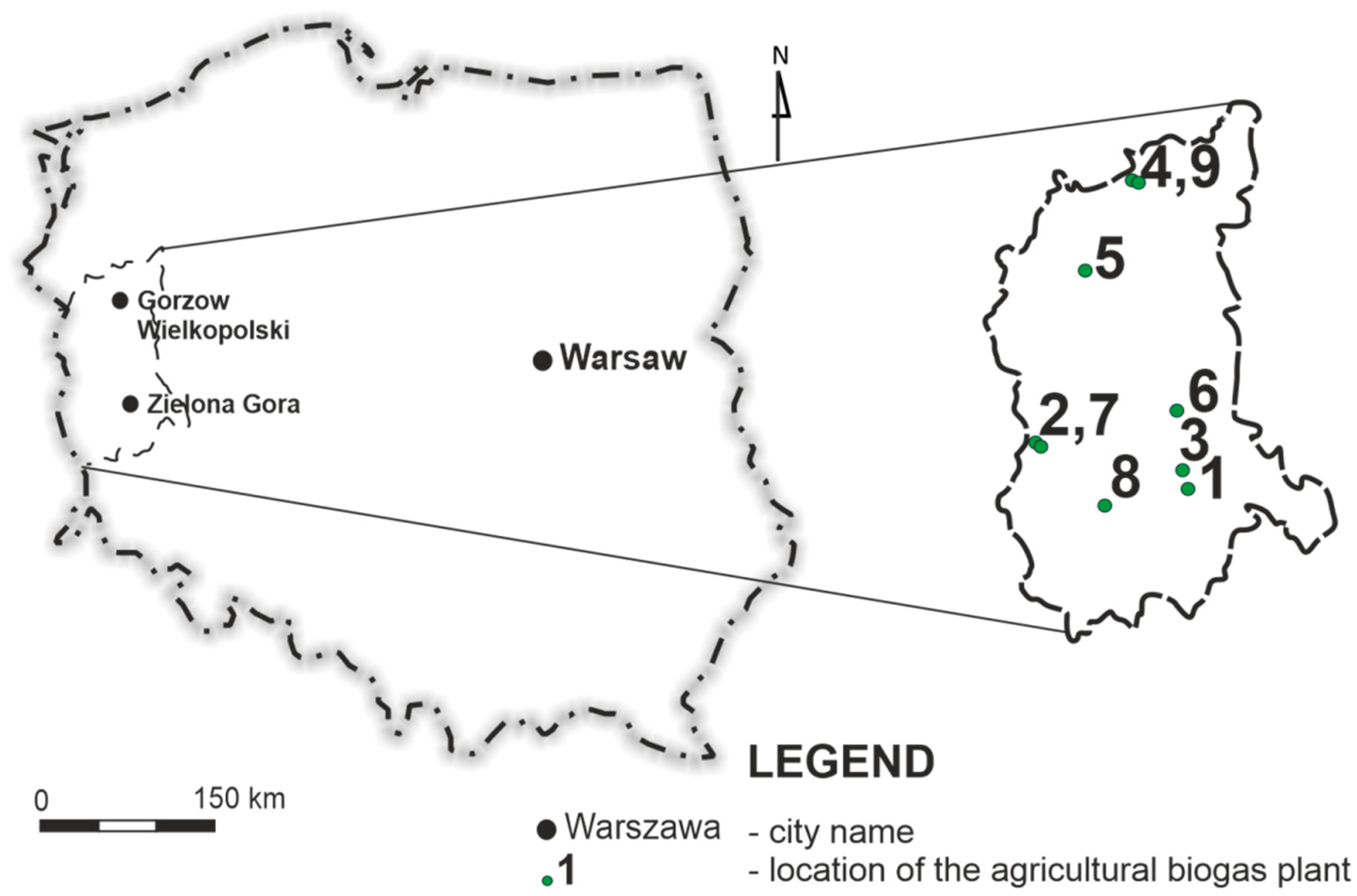 Figure 1), with a total installed electrical capacity of just over 152 MW, contrasts sharply—and unfavourably—with, for example, the approximately 9500 biogas plants in Germany, which have a total installed capacity of about 9300 MW. It is worth noting that Poland has around 1.5 million hectares more agricultural land than Germany and a highly developed agri-food processing sector that generates significant amounts of bio-waste [