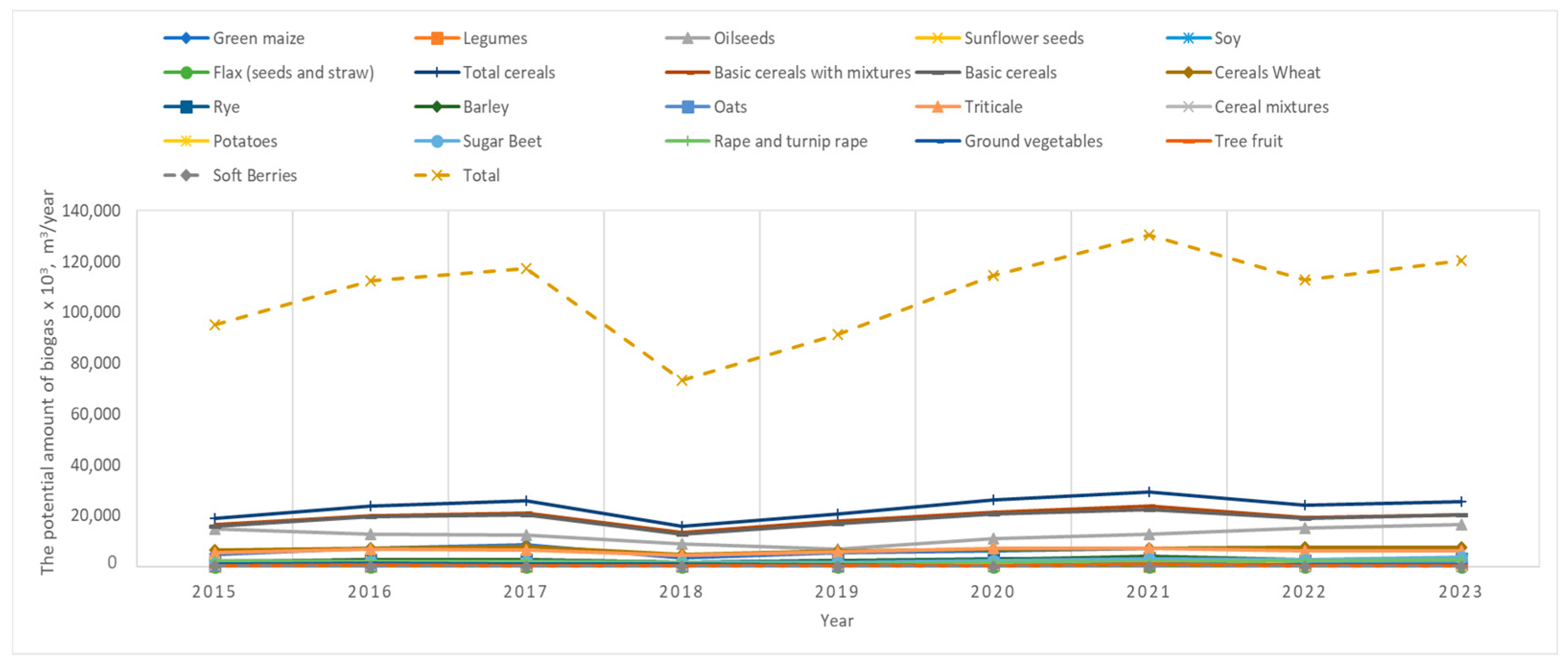 Figure 4. Oilseeds, together with green maize, were identified as having the highest biogas potential. This trend highlights the growing significance of these feedstocks in biogas production, primarily due to their high fat content and ease of processing in biogas plants. Other crop groups, including total cereals, also show an upward trend, albeit with more variability.