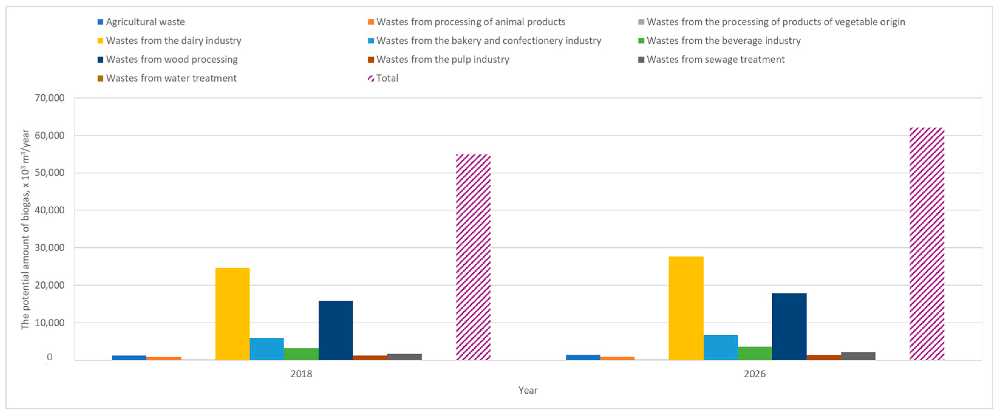 Waste from the dairy and wood processing industries exhibits the highest technical biogas potential in both 2018 and 2026 (