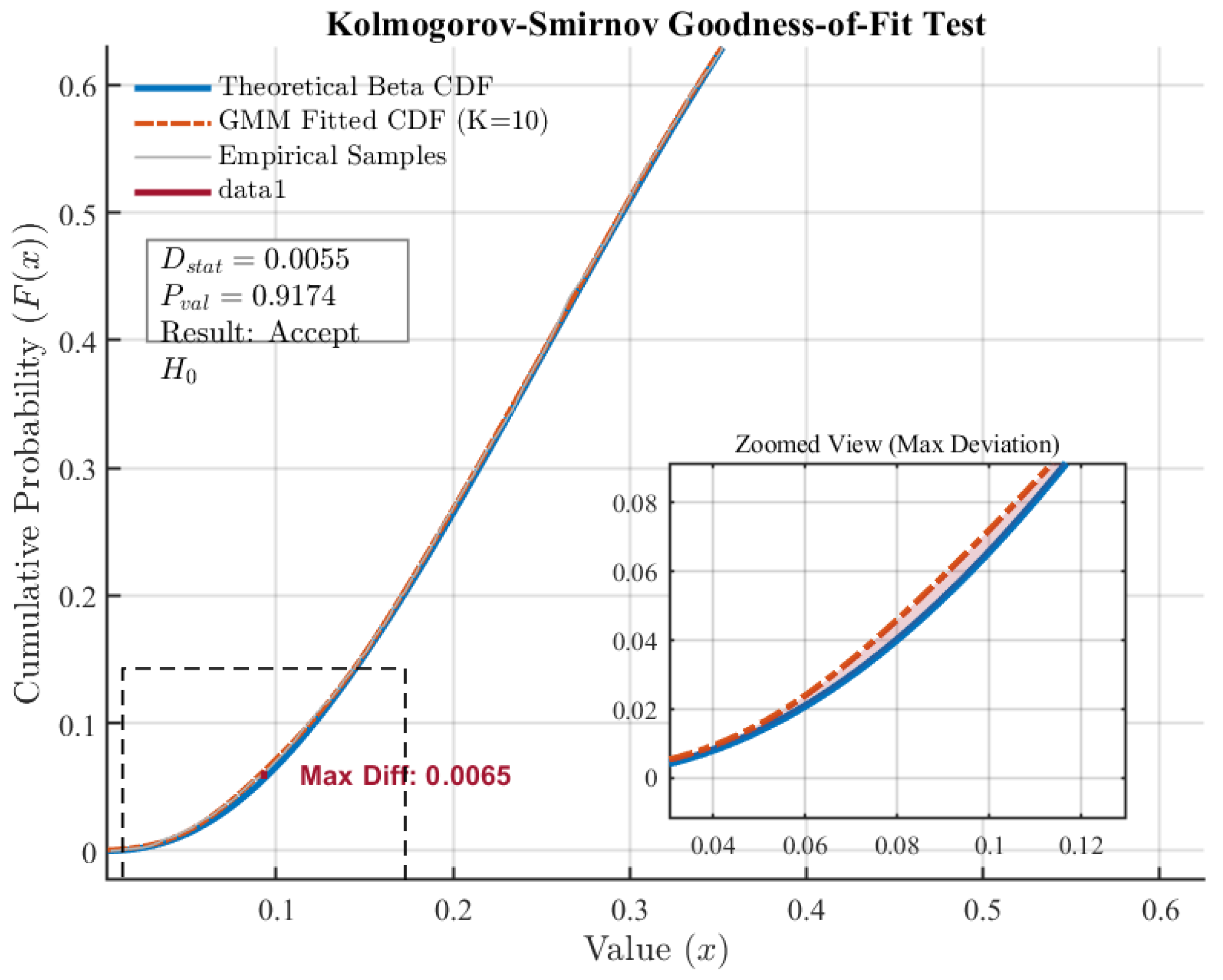 . This demonstrates that increasing the number of mixture components further improves the tail-fitting performance. Compared with the K-S test, the A-D test imposes stricter requirements on the tail behavior of the fitted distribution. The proposed GMM exhibits excellent performance under this more rigorous criterion, further confirming its effectiveness in modeling extreme disturbance scenarios.