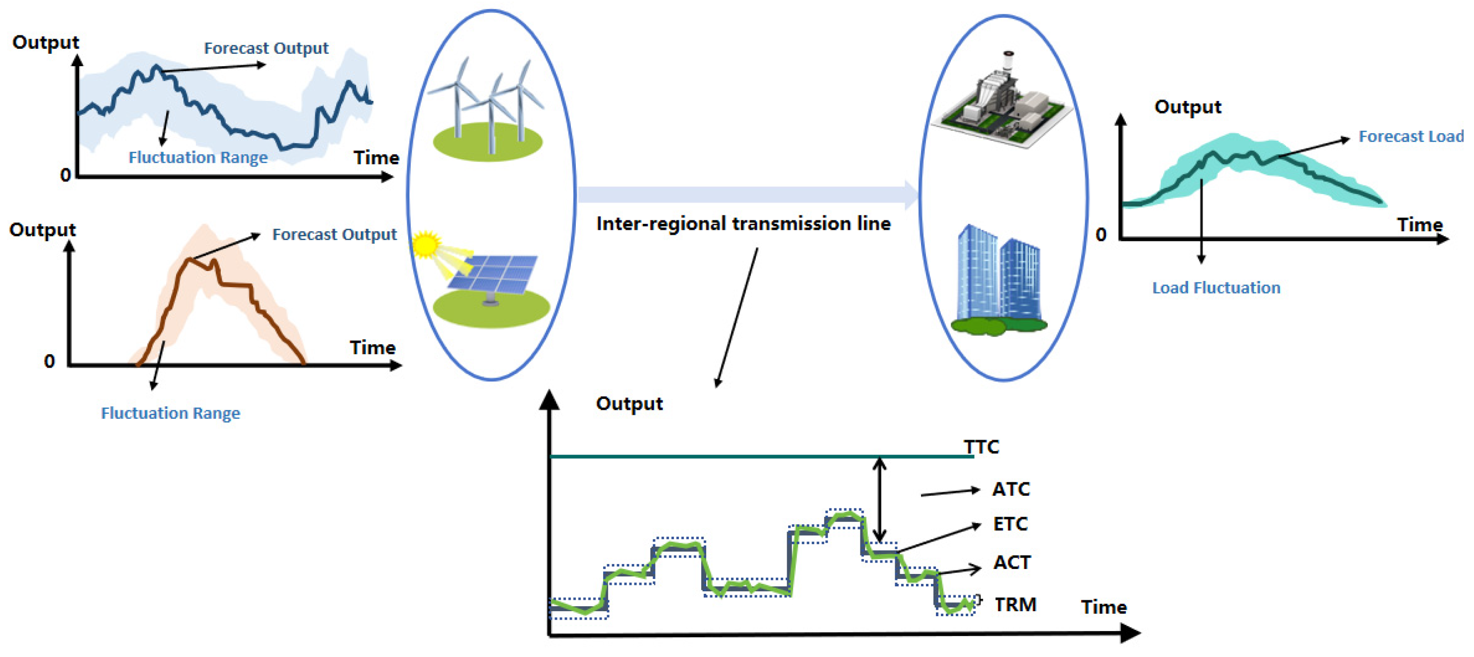 Figure 4, the figure depicts generations, loads, and contract execution deviation within the power system. On the source side, renewable generations such as wind and photovoltaic exhibit significant forecast uncertainty and fluctuation ranges. On the load side, demand also shows prediction errors and stochastic variations, which jointly affect the system power balance. In the transaction process, electricity flows along the transaction path are constrained by TTC, TRM, and CBM, resulting in the ATC. Meanwhile, discrepancies often exist between the ETC and the actual contractual transactions, further amplifying operational uncertainty.