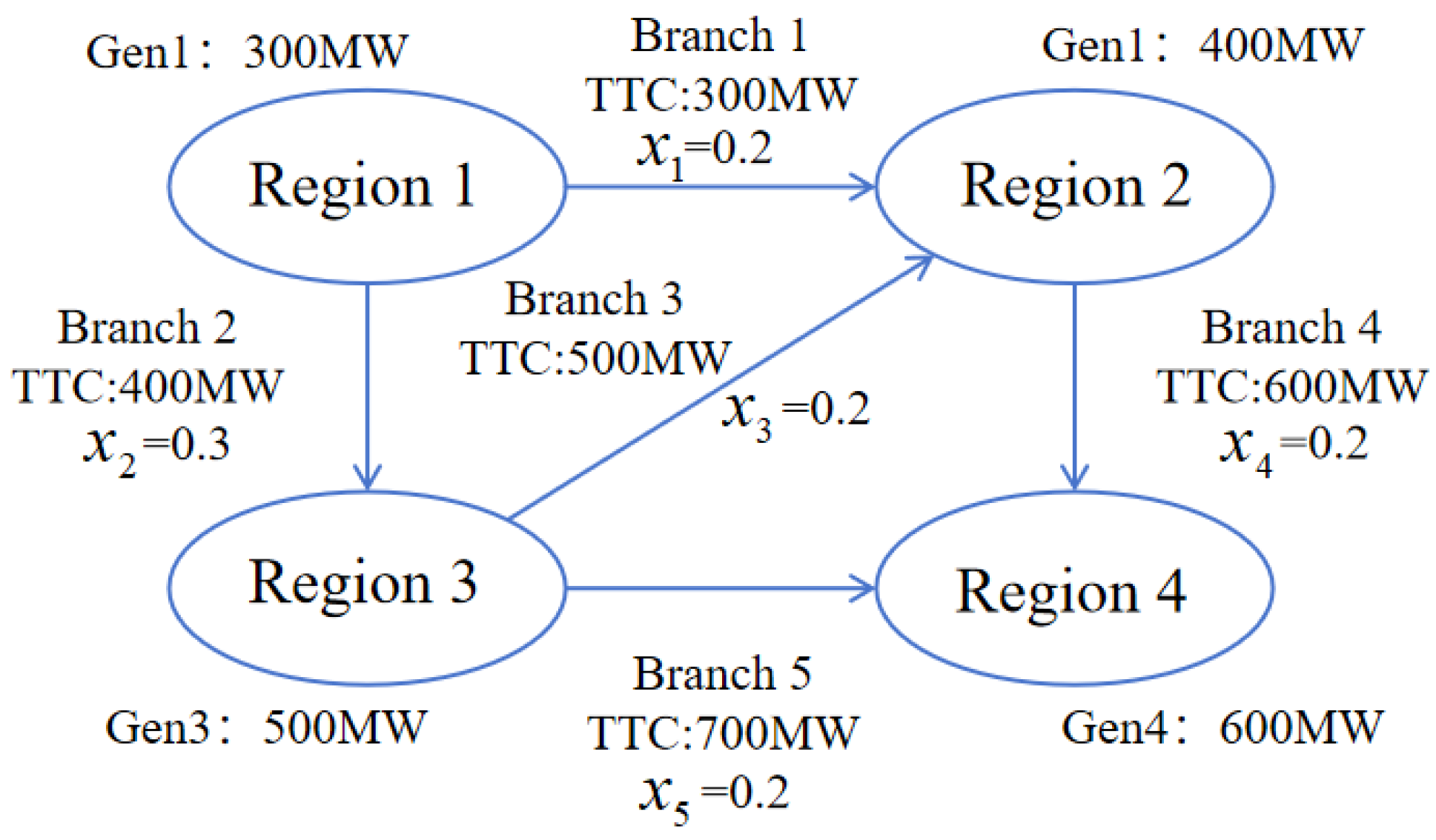 Figure 5. Only the transmission capacity of inter-regional links is considered, so the inter-regional network can be ignored and each region can be simplified to a node. The sources and loads within the region are connected to this node. This paper uses a 4-region system as a case study, which has the advantages of a simple structure, complete functionality, ease of analysis, and good scalability. The system includes reference nodes, multiple PQ nodes, AC interconnection branches, and typical power generation and trading disturbances, covering the core aspects of power flow calculation, sensitivity analysis, and TRM assessment. The system is of moderate scale, making it easy to control variables and visualize results, and is particularly suitable for method validation and result interpretation. Additionally, the structure has good scalability, allowing it to be smoothly expanded into larger-scale regional power grids or provincial power market models, laying the foundation for future research on AC/DC hybrid systems and power trading optimization.