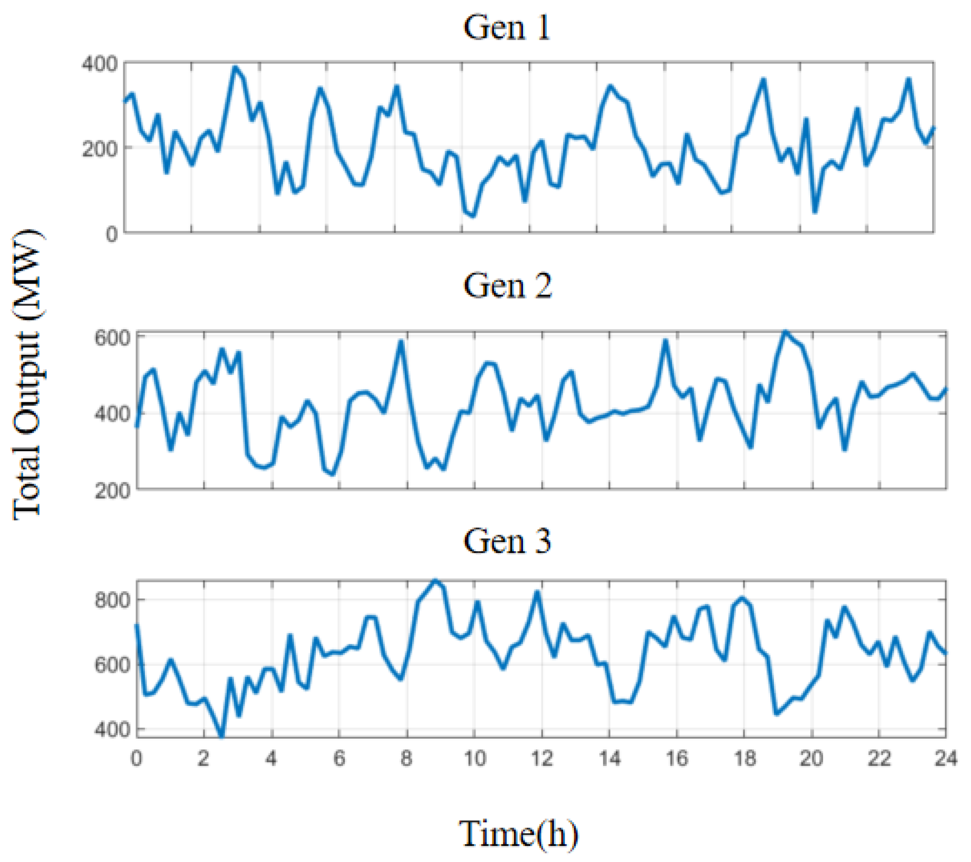 Figure 8 investigates the dynamic output timing adjustments of generation units under concurrent power generation disturbances and market trading disturbances, with consideration given to their temporal correlation characteristics. Each subplot corresponds to one renewable generator. The plotted curves represent the sum of the baseline generation and its stochastic disturbance modeled by a Beta distribution.