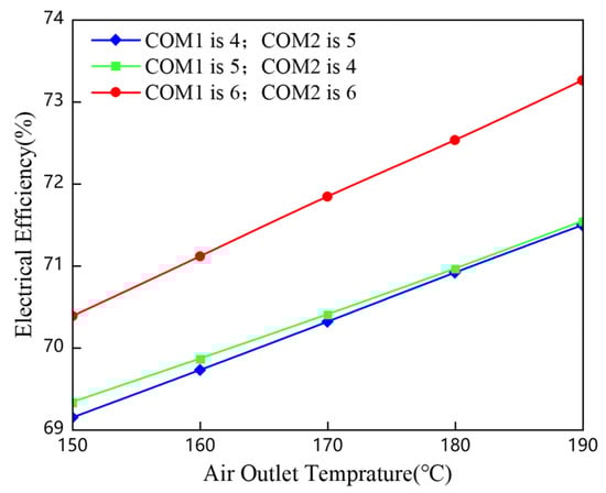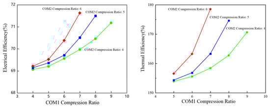 The variation in electrical and thermal efficiencies with COM1 compression ratio when COM2 is held constant.