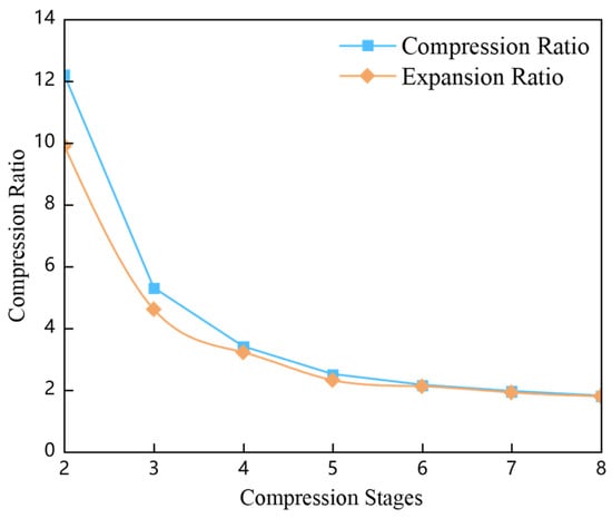 The relationship between the compression/expansion ratio and the number of stages demonstrates that reducing the number of compression stages leads to a progressive increase in the compression ratio allocated to each stage, as shown in Figure 4. This effect becomes significantly more pronounced as the number of stages decreases, resulting in a non-linear amplification of the per-stage compression ratio. The thermodynamic load on individual stages intensifies accordingly, necessitating careful consideration of mechanical and thermal constraints in system design.