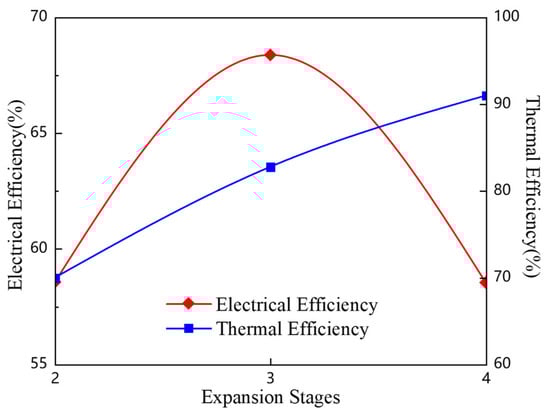 In the compression-expansion system model developed for this study, as shown in Figure 6, the stage count was varied between 2 and 4. Modifications to either compression or expansion stages demonstrated measurable impacts on both electrical and thermal efficiency. Figure 6 reveals distinct trends when maintaining 3 compression stages while increasing expansion stages from 2 to 4: electrical efficiency initially rises and then declines, while thermal efficiency shows gradual but decelerating improvement.