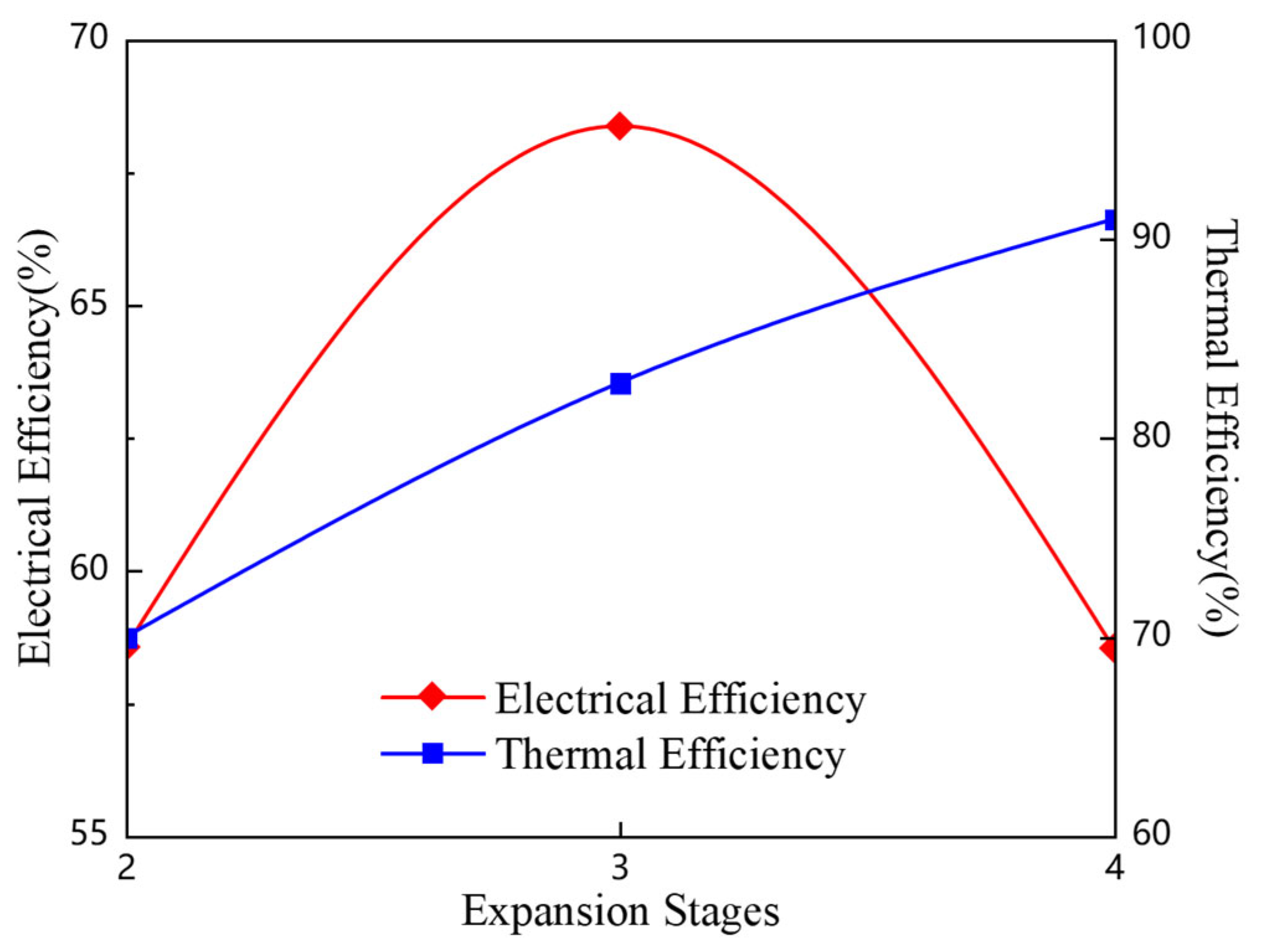Figure 6 reveals distinct trends when maintaining 3 compression stages while increasing expansion stages from 2 to 4: electrical efficiency initially rises and then declines, while thermal efficiency shows gradual but decelerating improvement.