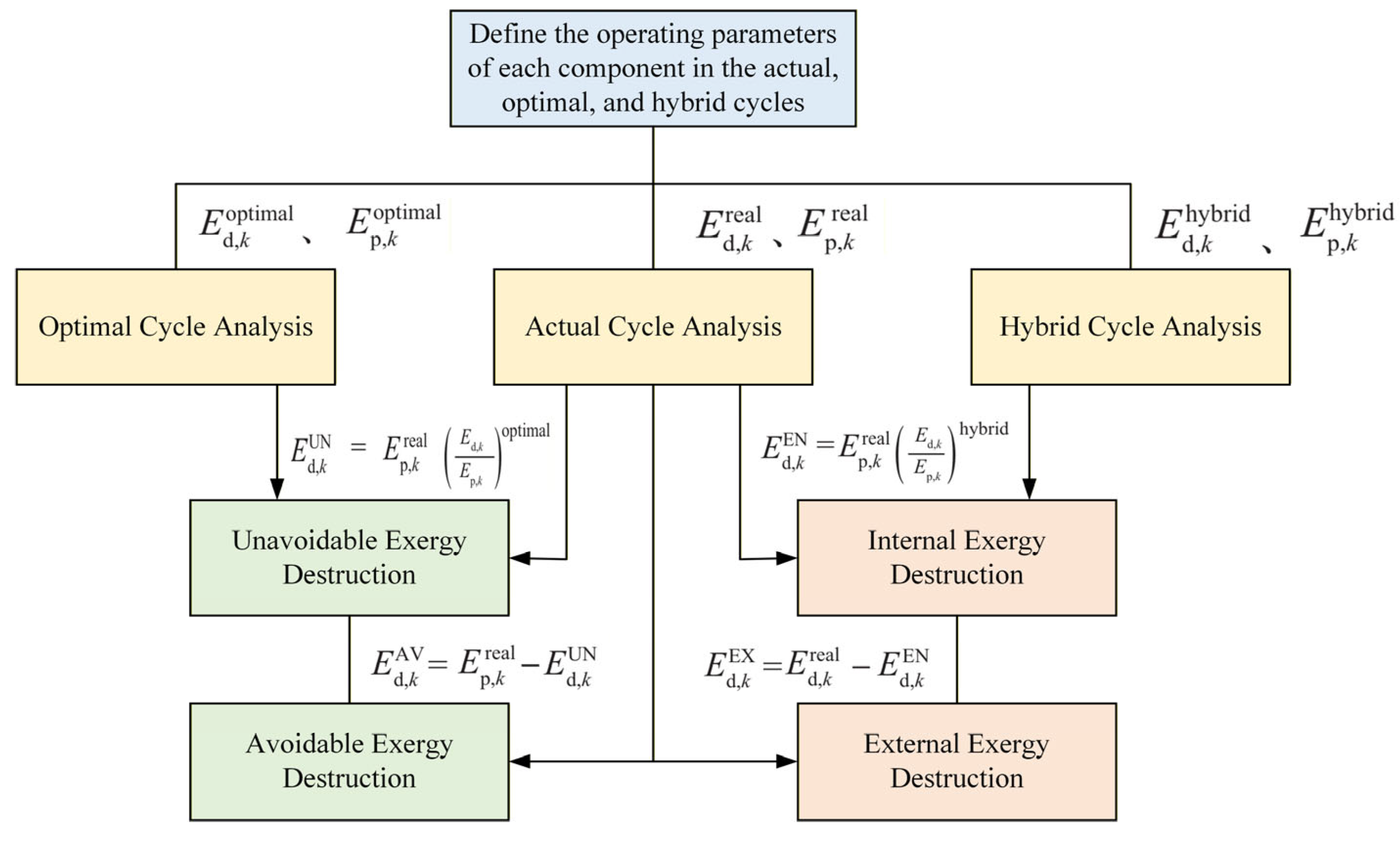 This study employs a systematic exergy analysis approach, establishing a comprehensive framework for evaluating exergy destruction through three key analytical models: the actual operational cycle, the ideal optimal cycle, and the hybrid cycle. The methodology begins by distinguishing between avoidable and unavoidable exergy losses in system operation by comparing the actual operational cycle with the ideal optimal cycle. It then accurately identifies the distribution characteristics of endogenous and exogenous exergy destruction through analysis of the actual operational cycle versus the hybrid cycle. Finally, the approach quantifies the unavoidable endogenous exergy destruction component by comparing the ideal optimal cycle with the hybrid cycle.