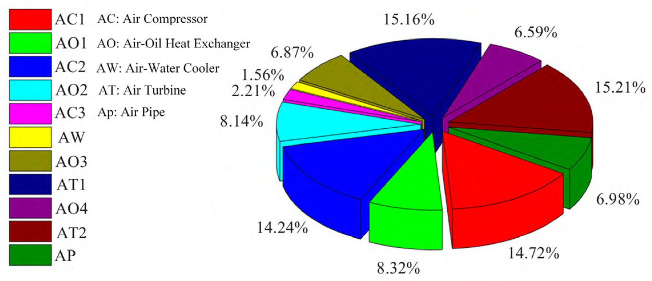 The exergy analysis results derived from the system’s actual operational cycle, as illustrated in the accompanying figure, clearly reveal the distribution and relative contribution of exergy losses across major components during a complete operational cycle. The analysis demonstrates that compressors and expansion turbines-being the core energy conversion devices-exhibit significantly higher exergy destruction compared to other components [