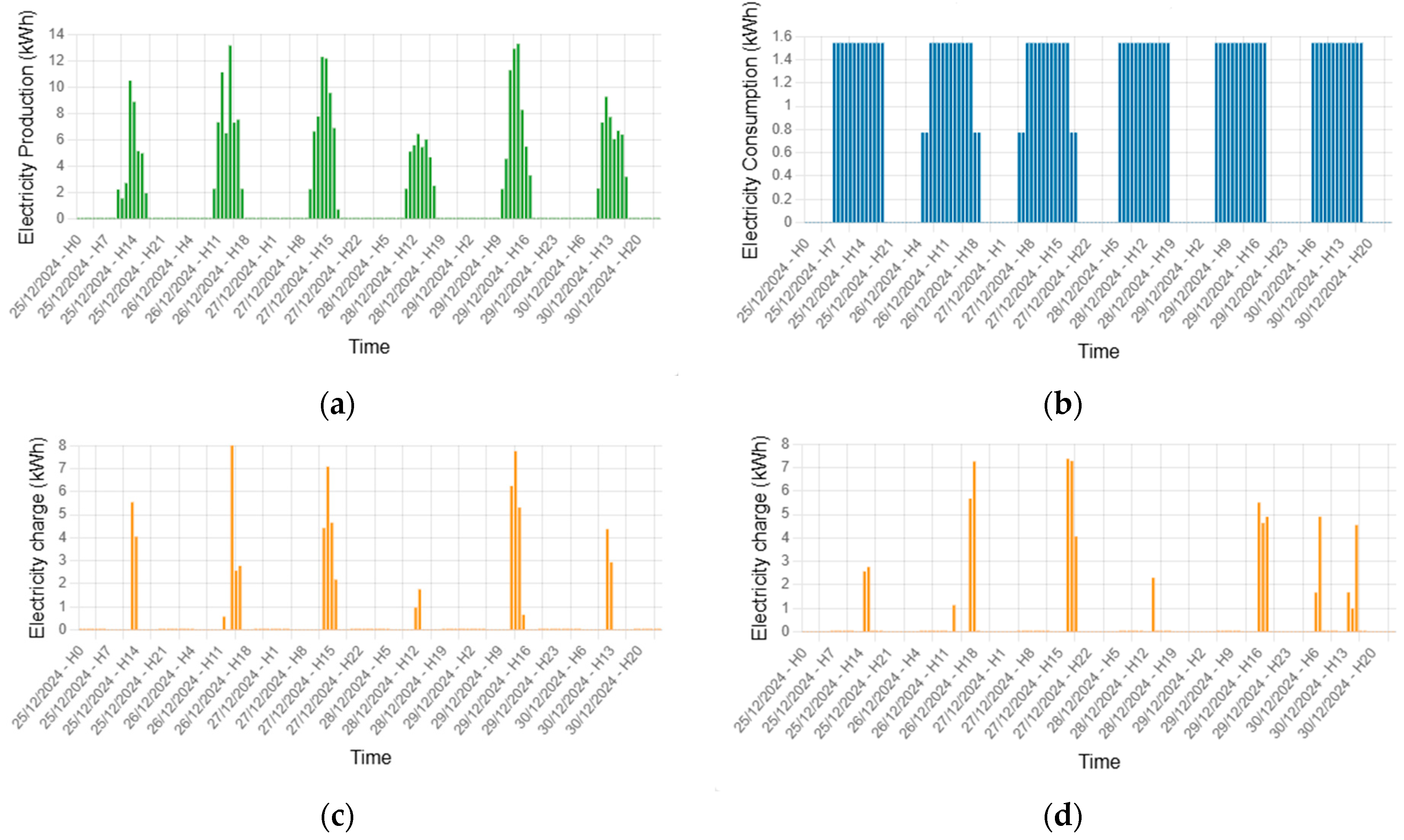 - and are the cumulative charges at time-step that the EV chargers provided over the previous 96 h, stemming from their RES and the grid, respectively.