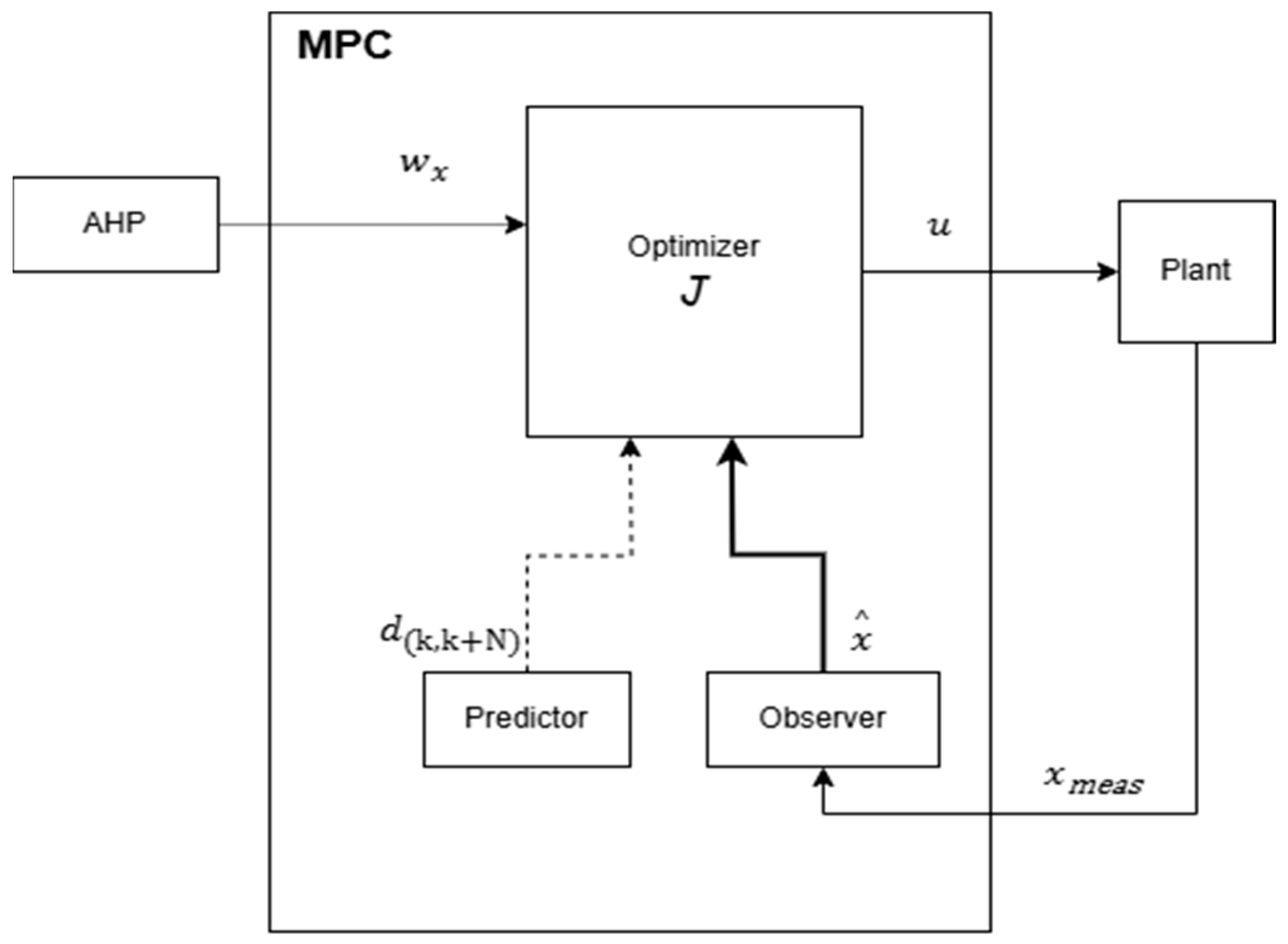 Optimizer Module: Integrates inputs from the AHP-derived weighting coefficients (wx), predictor module forecasts, and observer measurements (x^). By solving an online optimization problem at each time step, it determines the optimal control actions (u) for climatic and irrigation management systems—such as heating, cooling, lighting, CO2 injection, humidity regulation, and irrigation. The optimization aims to minimize the defined objective function while strictly adhering to operational constraints.