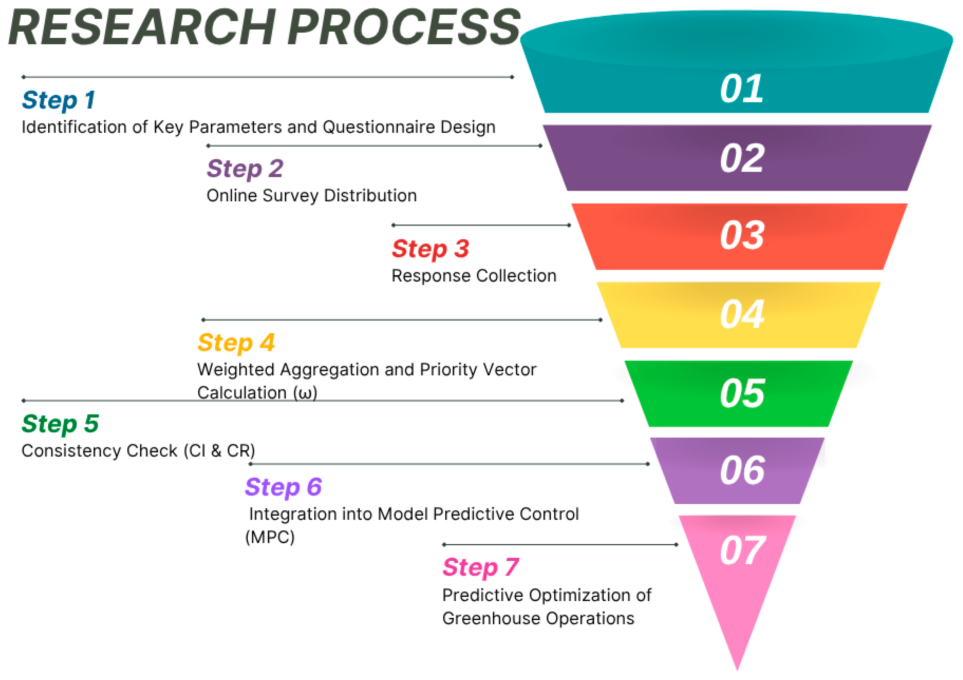 The methodology follows a structured seven-step pipeline that connects expert knowledge to predictive control (see Figure 3). First, relevant greenhouse climate criteria are identified, and a detailed questionnaire is designed. The survey is then deployed online to professionals across multiple domains, and responses are collected. Pairwise judgments from experts are aggregated using a weighted geometric mean and converted into a priority vector ω via the principal eigenvector method. Logical coherence of the responses is verified through the Analytic Hierarchy Process (AHP) consistency index and ratio.