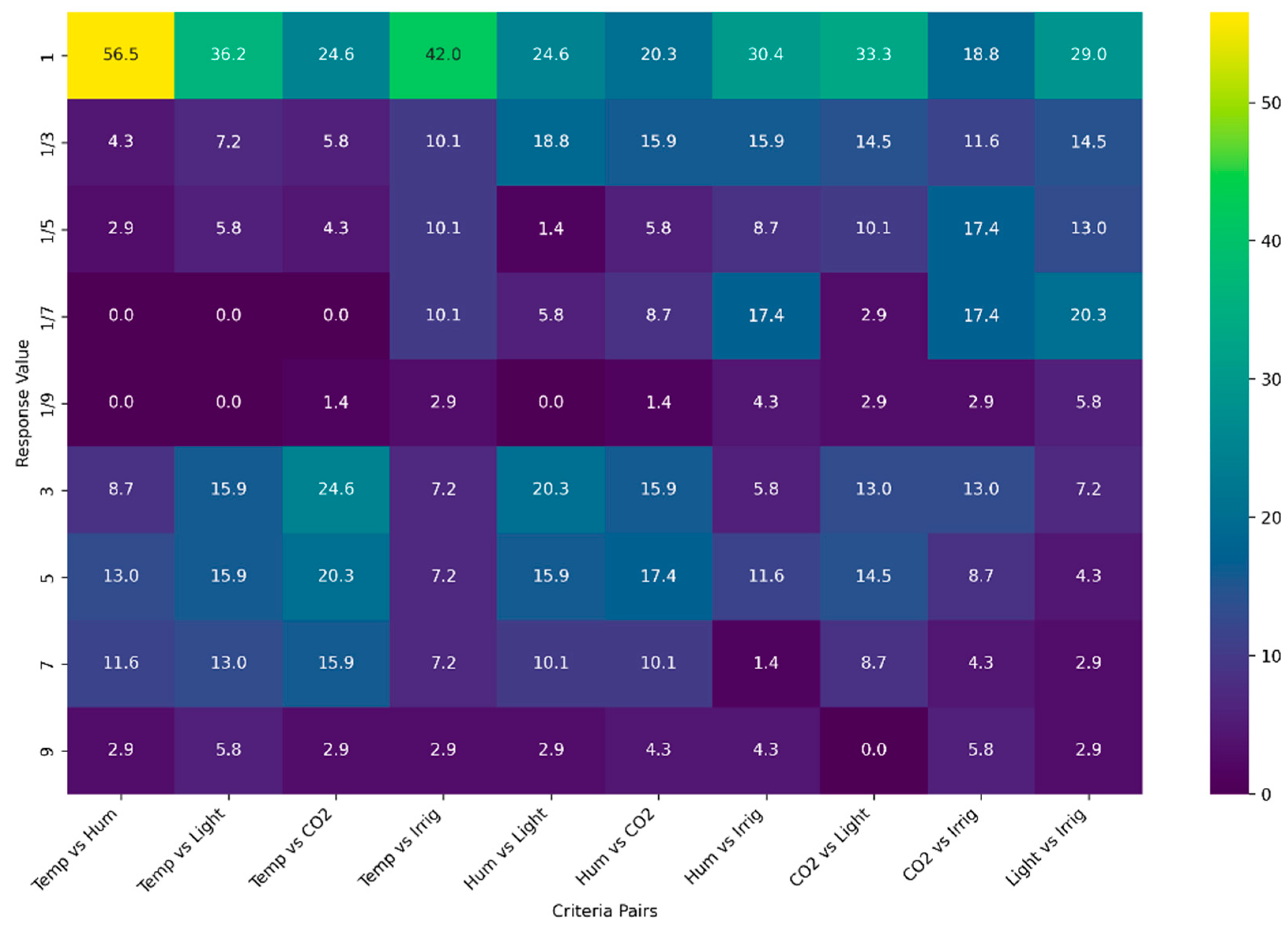 Figure 5 presents a heatmap displaying the percentage distribution of respondents’ judgments for each pairwise comparison of climatic parameters. Each cell indicates the proportion of participants assigning a given AHP importance value (as defined in Table 1) to a parameter pair. This visualization reveals prevailing trends and areas of consensus or divergence among experts, offering a clear and intuitive interpretation of their prioritization preferences.