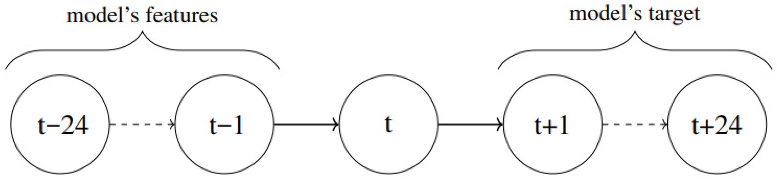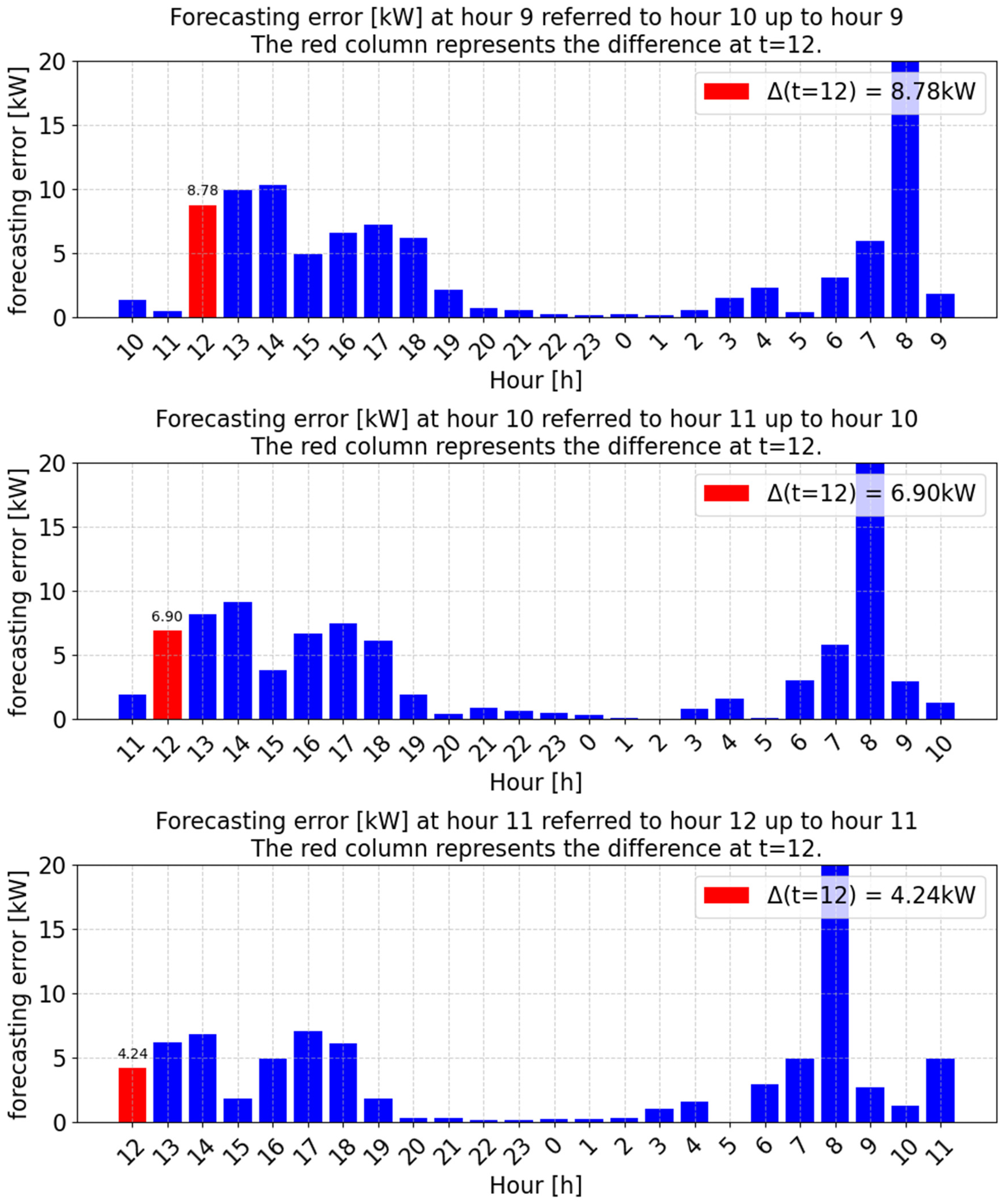 - Input data are available with a timeliness adequate to allow for hourly forecast updates. Consequently, the proposed algorithm is suitable for practical deployment, since it can be used in near real-time, for instance, to input reliable and updated power production forecasts into EMSs.