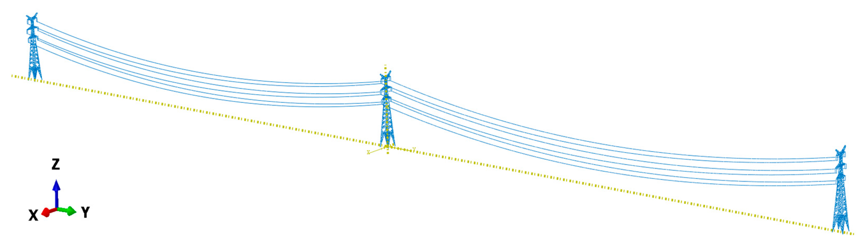 By applying the aerodynamic load on the conductors, we can simulate and analyze the ice-induced galloping of the transmission conductors. Based on the operating conditions set in this paper, the coupled effect of the aerodynamic lift and aerodynamic drag of the conductor determines the vibration mode of the conductor. The time history data for the midpoint displacement of the conductors are shown in