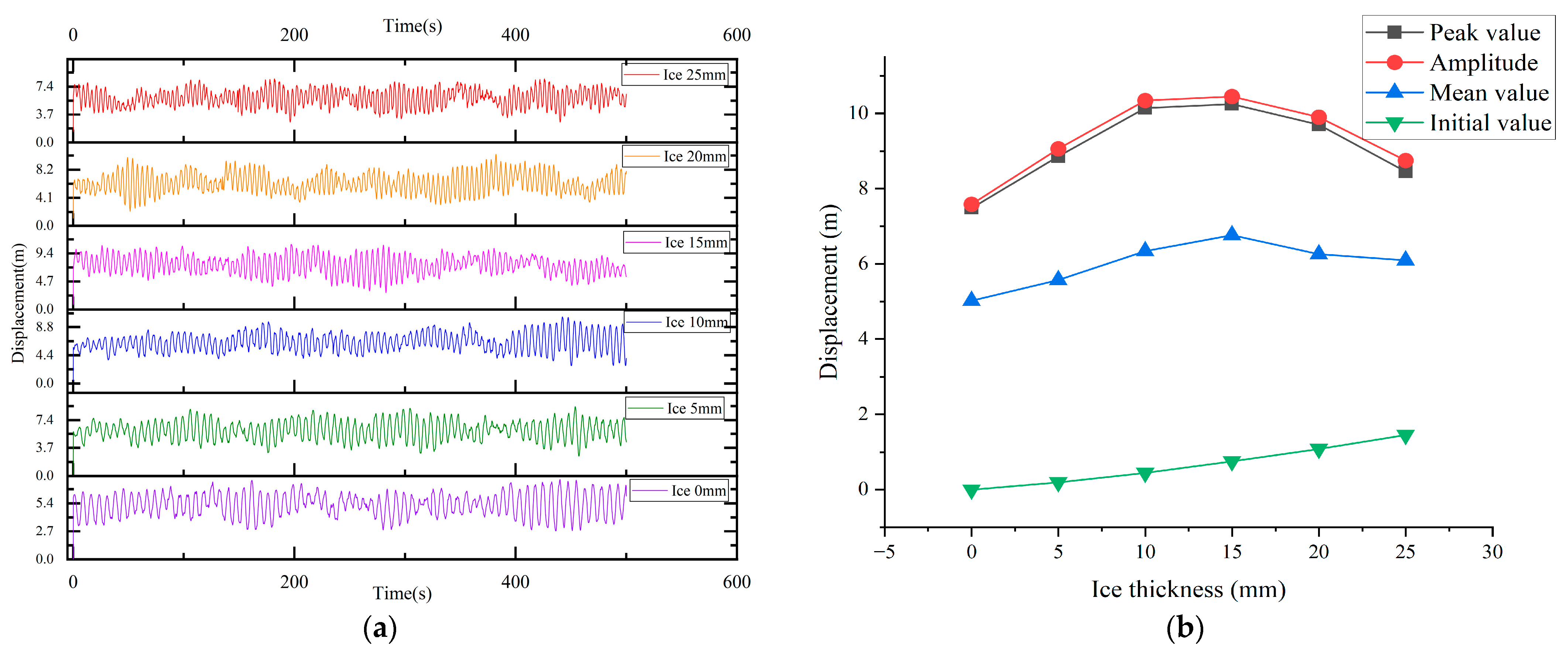 In the first type of operating conditions, the span of the conductor and the wind speed of the tower–line system remain unchanged, while the ice thickness gradually increases. When the ice thickness is small, the displacement of the conductor under wind load based on the same wind speed increases significantly. In this scenario, the gravitational effect of the ice directly increases the vertical load (dead load) of the conductor, leading to an increase in sag. The ice thickness and load increase linearly. However, within the elastic range of the material, the increase in sag is nonlinear, usually accelerating with the increase in load. When the ice thickness exceeds a certain level (15 mm in the simulation results of this study), inertial effects become dominant, and the mass of the conductor system increases sharply. Under the same external force (wind load), objects with greater mass exhibit smaller acceleration, and the huge inertial force suppresses the movement of the conductor.