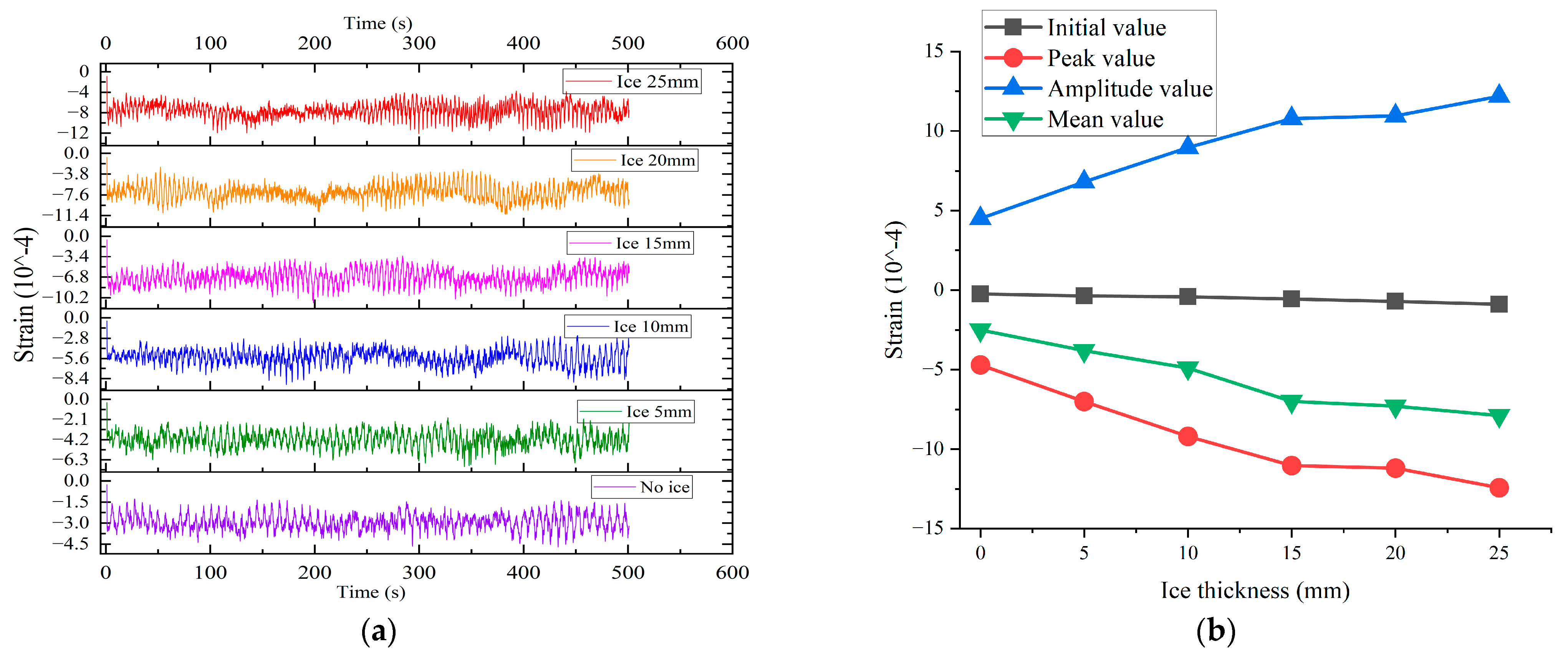 Under the first working condition, since the magnitude of the wind speed and the horizontal span of the conductors are specified, only the influence of the ice’s thickness on the crossarm strain is analyzed. The comprehensive coefficient