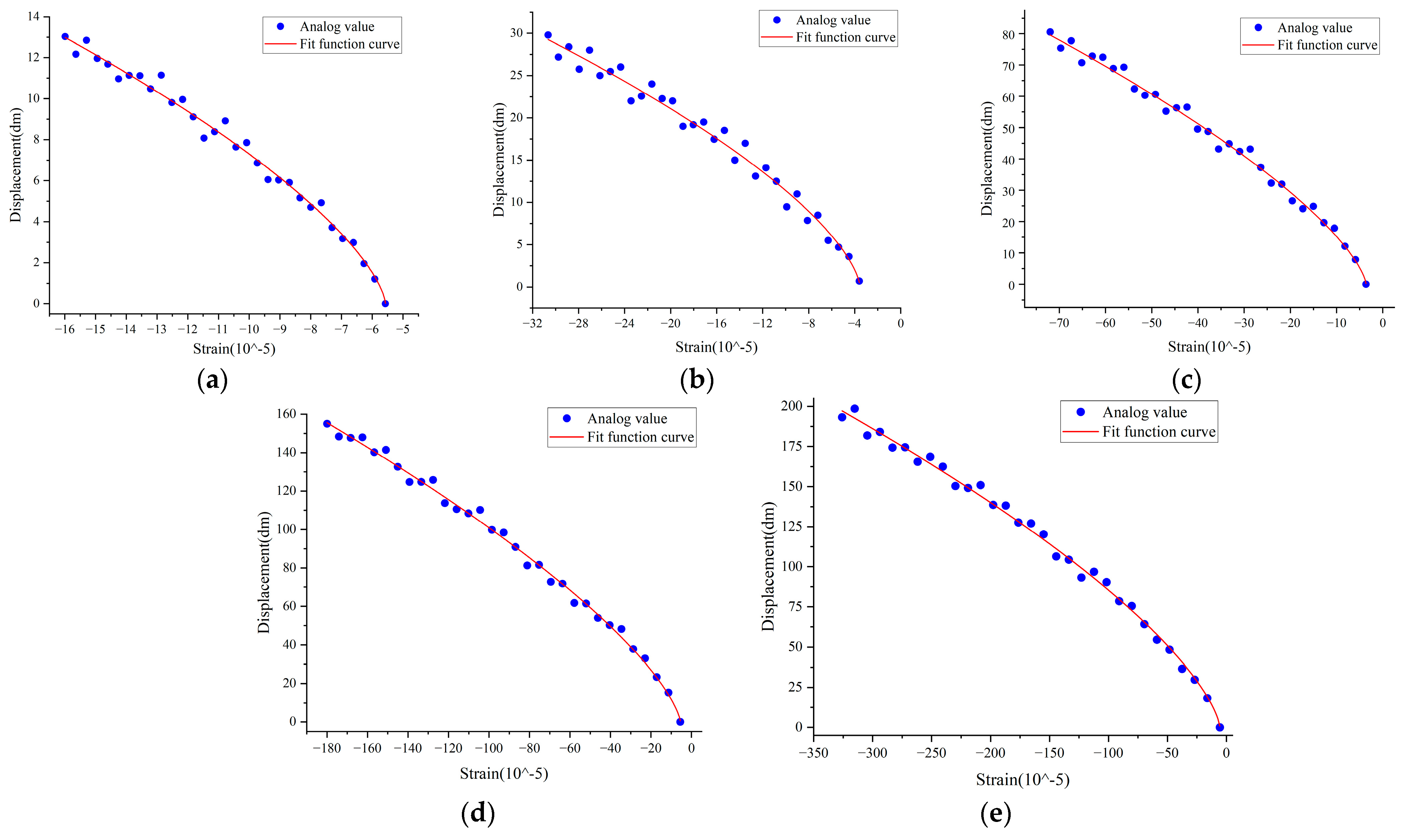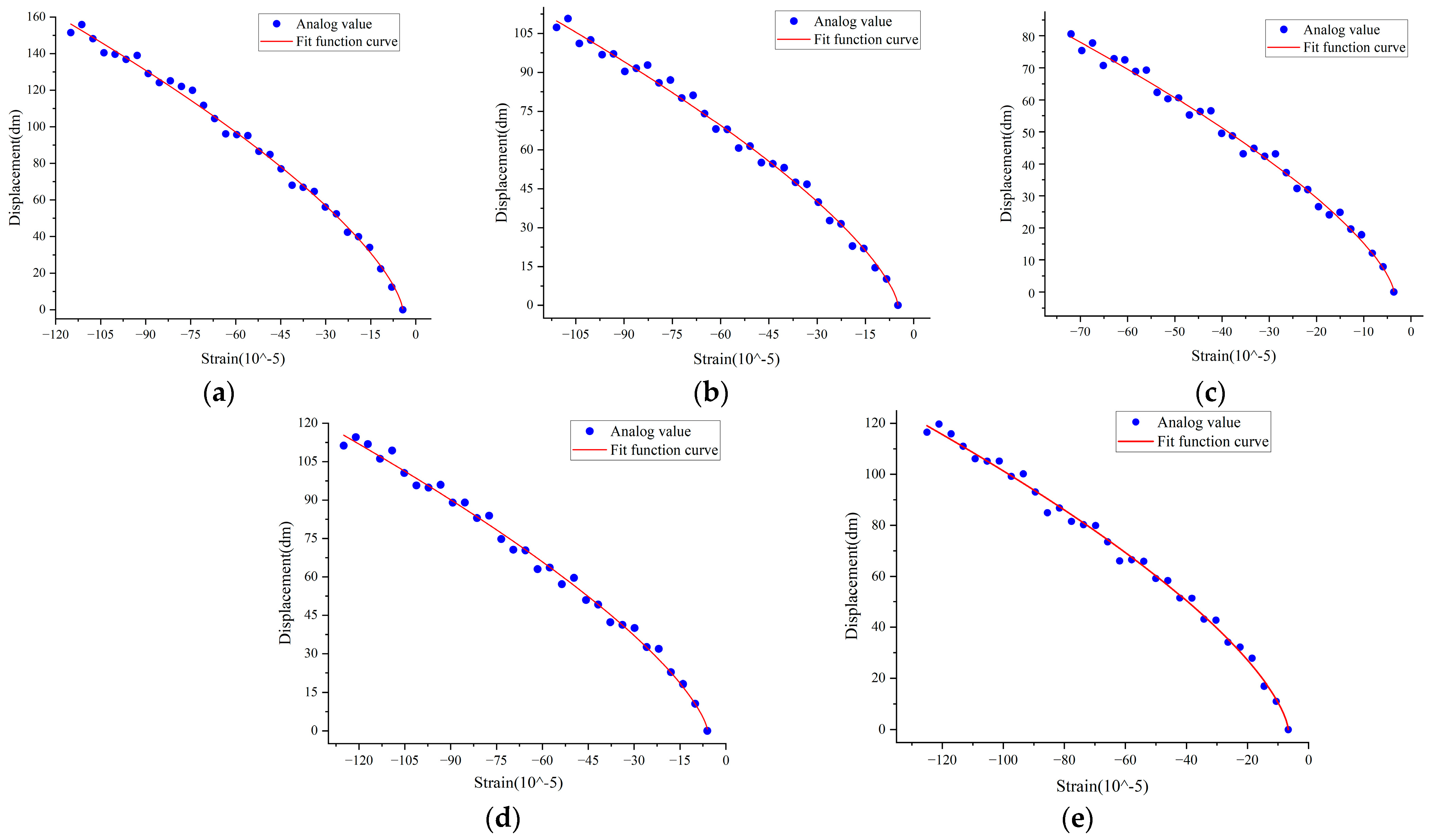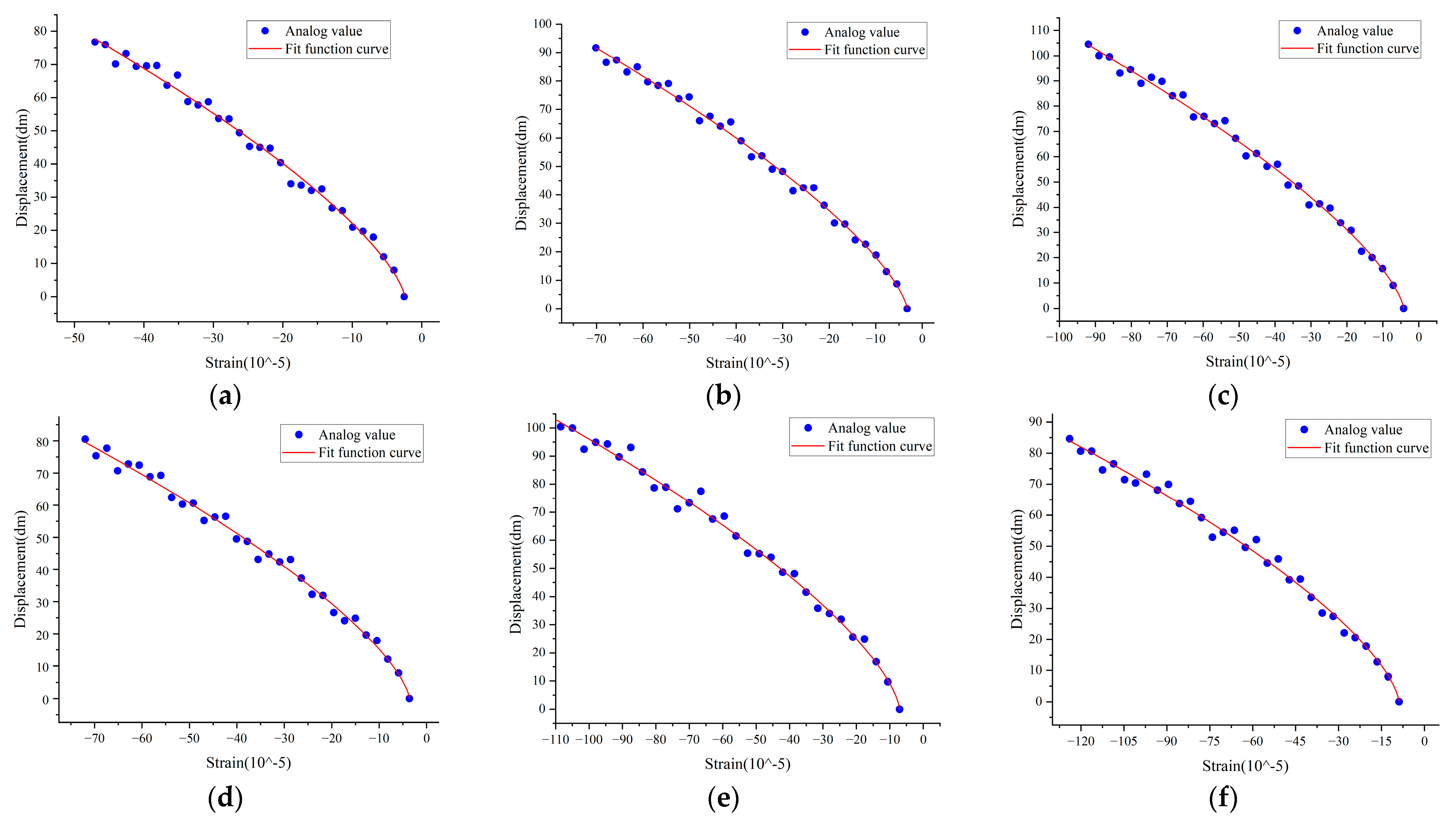 When constructing the functional relationship, the crossarm strain is selected as the independent variable, and the resultant displacement at the midpoint of the conductor is chosen as the dependent variable. First, a dataset of crossarm strain-conductor midpoint displacement is established. Based on the strain amplitude, the data is uniformly divided into 30 numerical intervals. Since this study focuses on time-domain analysis of crossarm strain and conductor displacement, each crossarm strain value has a corresponding conductor midpoint displacement value at the same moment. Therefore, the median of the strain values in each interval and the average of the corresponding conductor midpoint displacements at those moments are calculated to establish strain-displacement ordinal pairs. These ordinal pairs are then plotted as scatter points. Finally, function relationships are fitted for the displacement-strain scatter plots of each working condition, thereby establishing the functional relationships between conductor displacement and crossarm strain under various working conditions. The fitted functional relationships between conductor resultant displacement and crossarm strain under each working condition are shown in