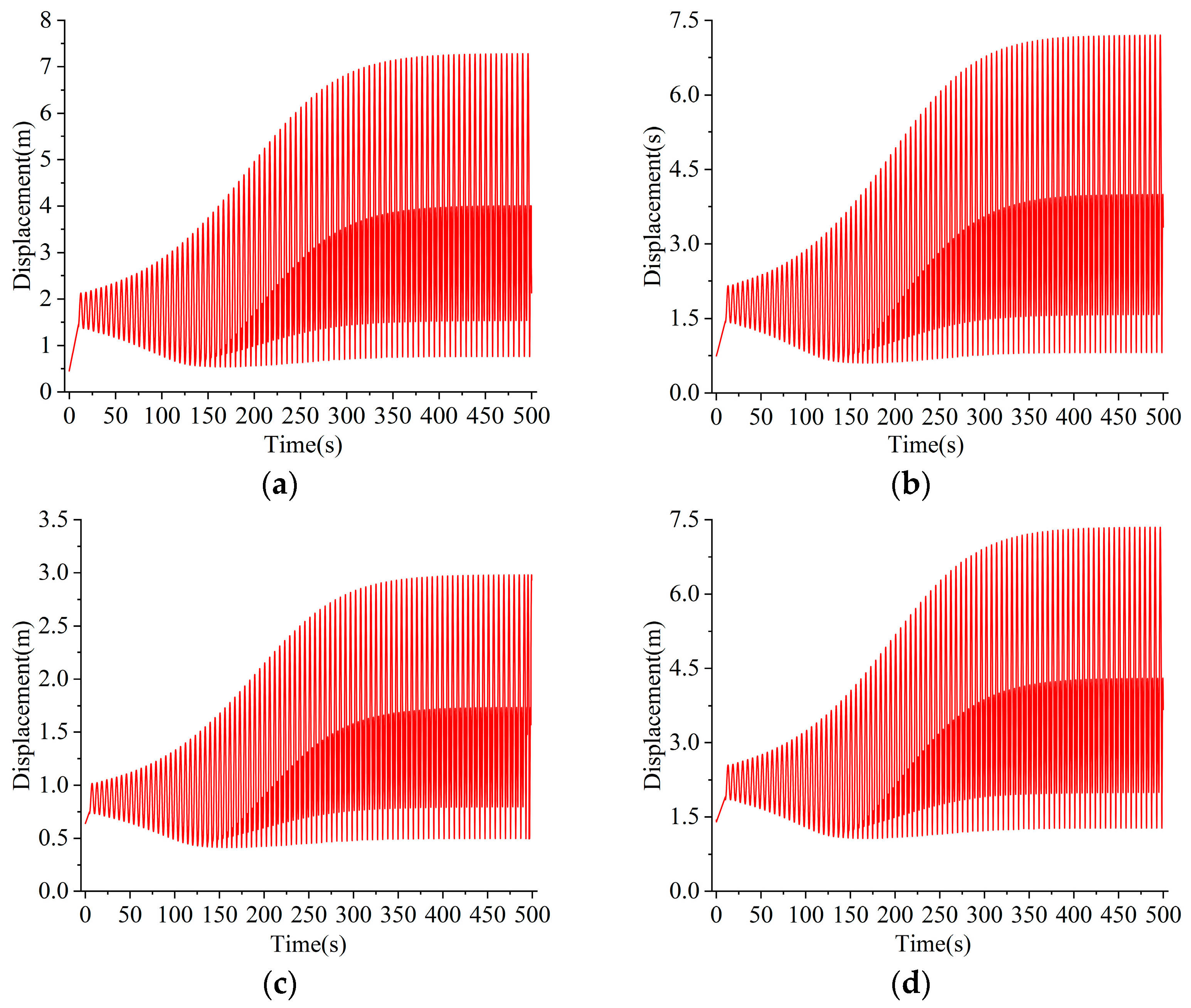 Figure 17. Under the action of a constant external wind load, the galloping amplitude of iced transmission conductors develops gradually and finally reaches a stable state after more than 350 s. During the process of iced conductor galloping, the development trend and amplitude of the mid-span displacement of the conductor are basically consistent with those described in references [