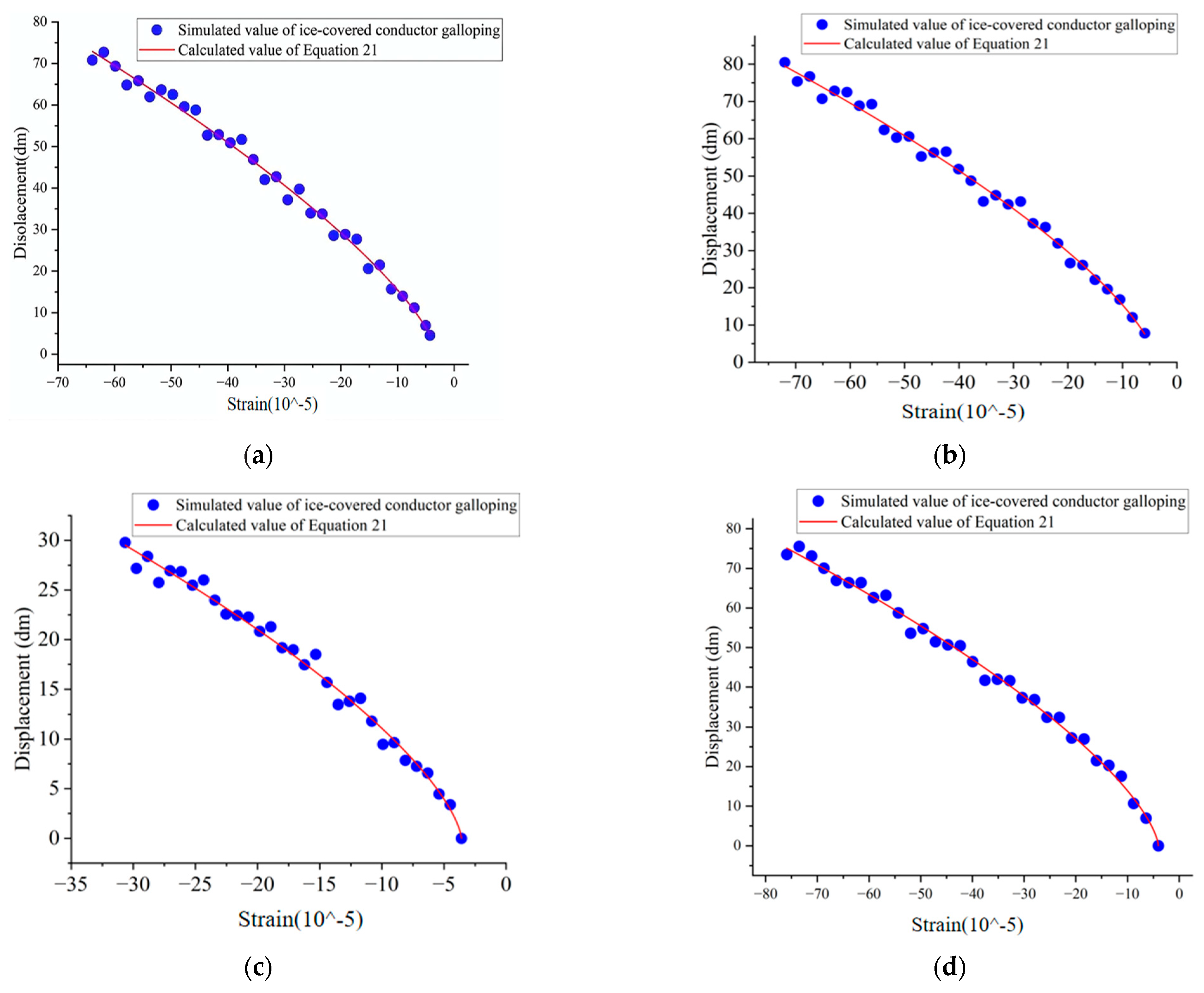 By comparing the strain–displacement simulation values with the curve calculated using Equation (22), it can be observed that the strain–displacement data points based on conductor galloping fluctuate around the calculated values of Equation (22). Under the four working conditions—A, B, C, and D—the maximum errors are 4.75%, 6.43%, 10.58%, and 5.62%, respectively, with the overall error being controlled within 11%. This indicates that the fitting formula exhibits good applicability to the galloping of ice-covered transmission conductors.