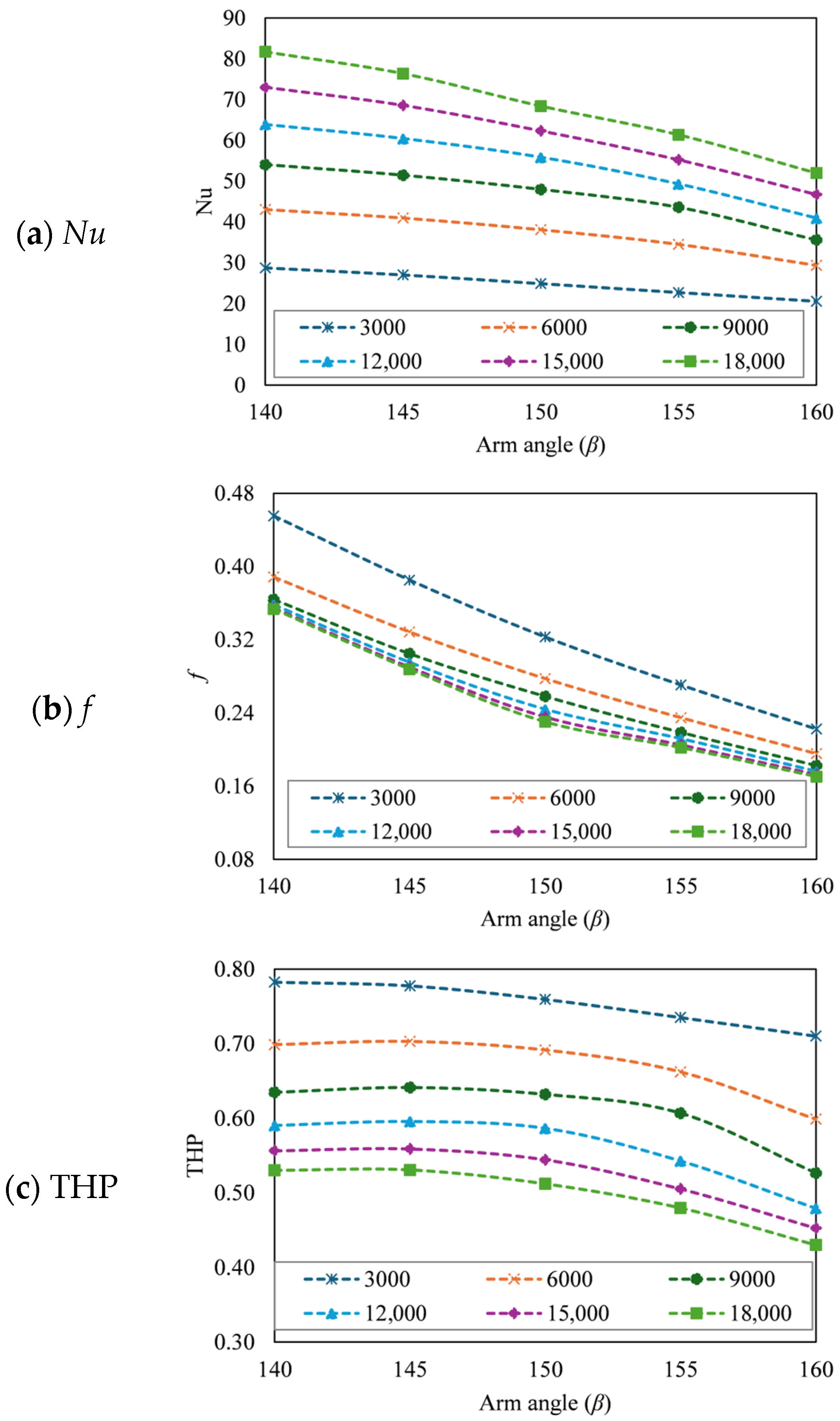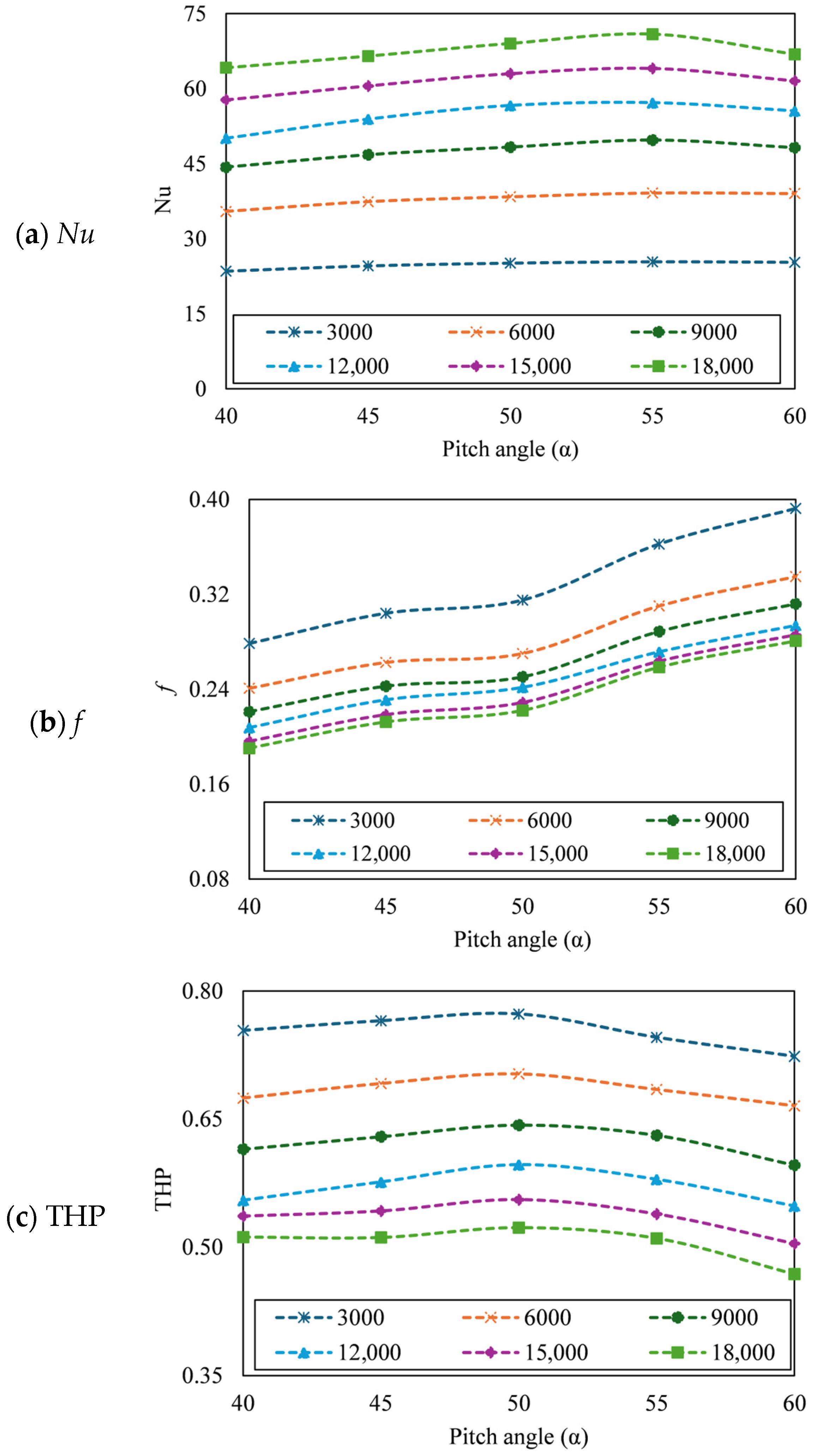- The Reynolds number, Nusselt number, and friction factor were evaluated to determine the thermal and hydraulic performance and THP.