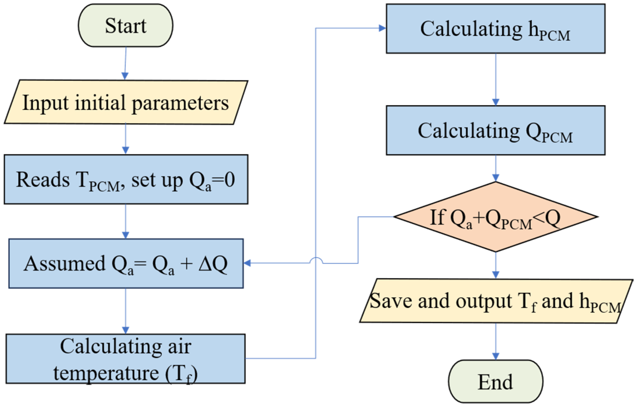- Compute current air temperature Tf from Qa, then determine convective coefficient hPCM and plate absorption QPCM.