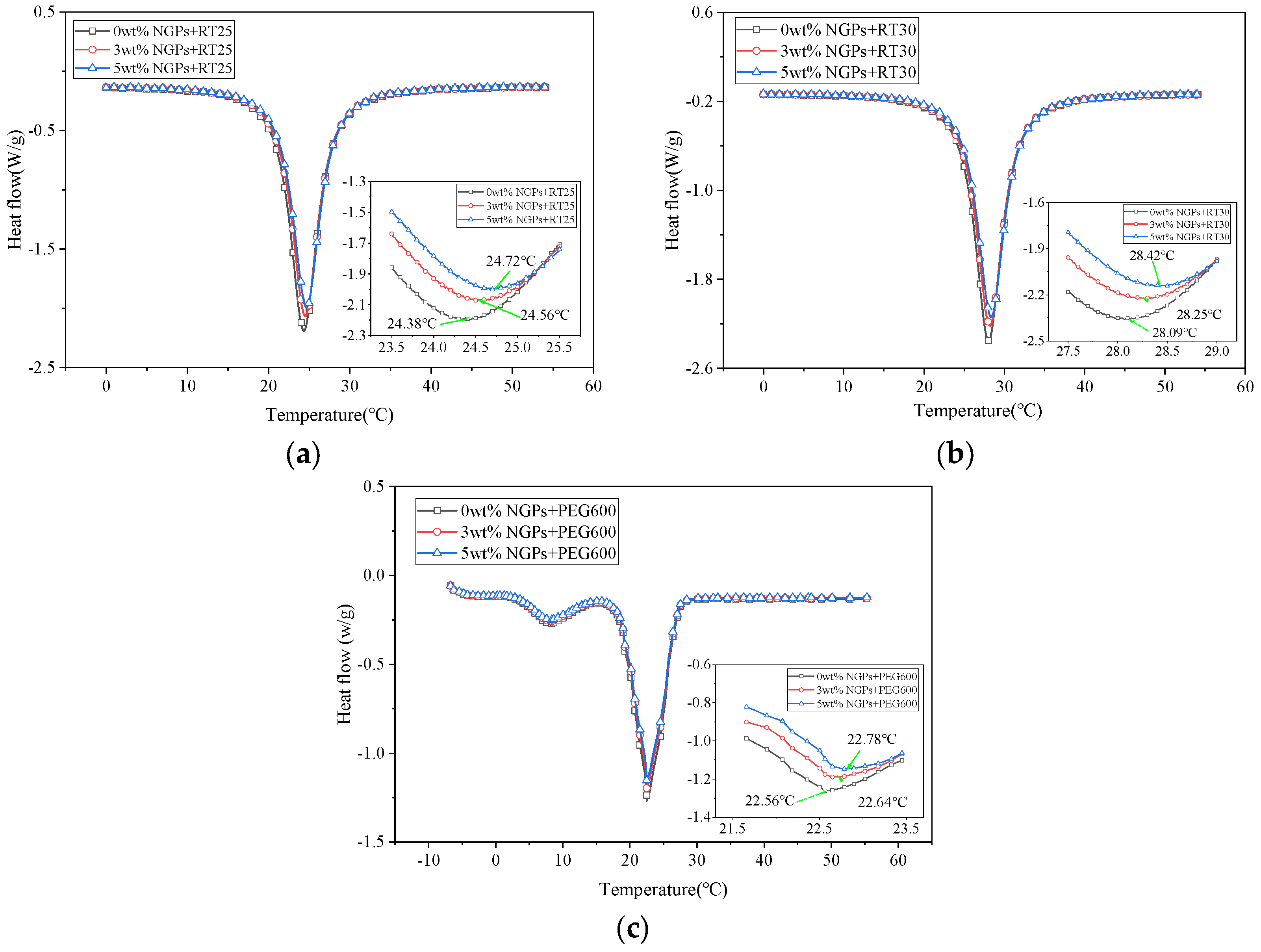 - Adding NGPs significantly increases the thermal conductivity of PCMs but simultaneously reduces their latent heat capacity. For example, adding 5 wt% NGPs to RT25 increased the thermal conductivity by 0.19 W/(m·°C) and reduced the phase change latent heat by 15.3 kJ/kg.