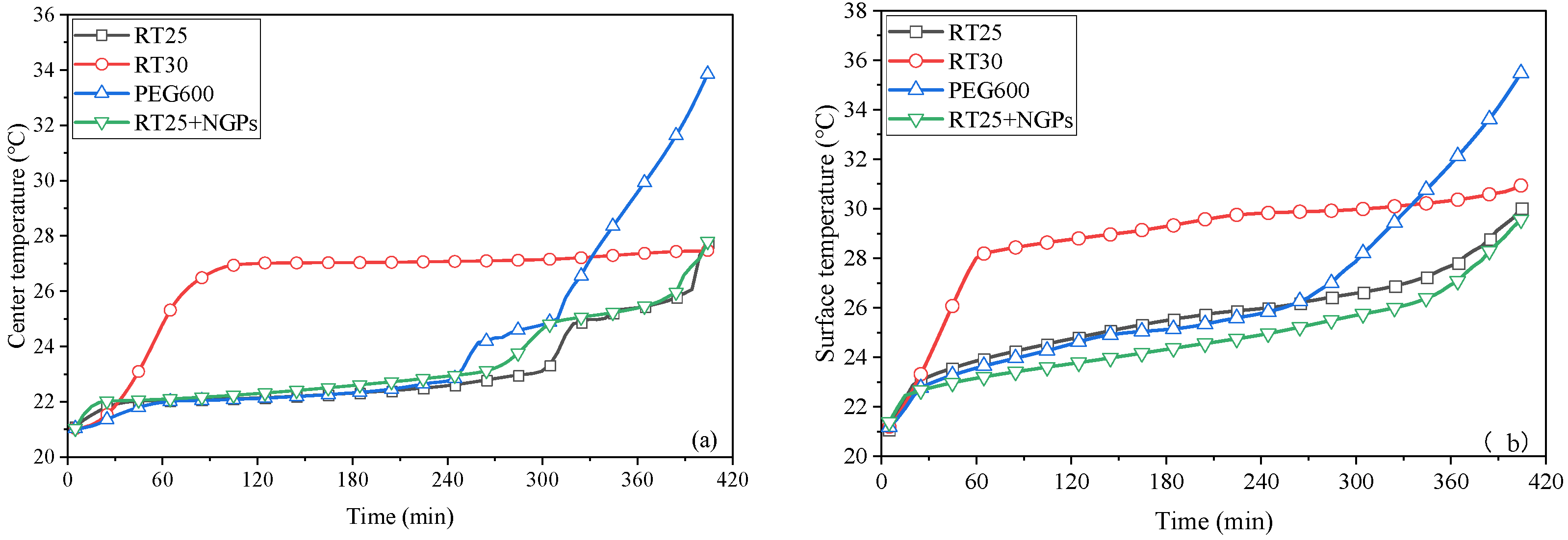 - PCMs with higher melting points have longer temperature control times, and PCMs with larger latent heat and broader phase change intervals exhibit flatter melting curves. For example, the RT25 PCM shows the best thermal performance among tested PCMs, with lower wall and air temperatures and minimal late-stage temperature increase. Adding 5 wt% NGPs enhances its thermal conductivity, slightly raising the plateau temperature but significantly lowering the surface temperature by 1.02 °C.