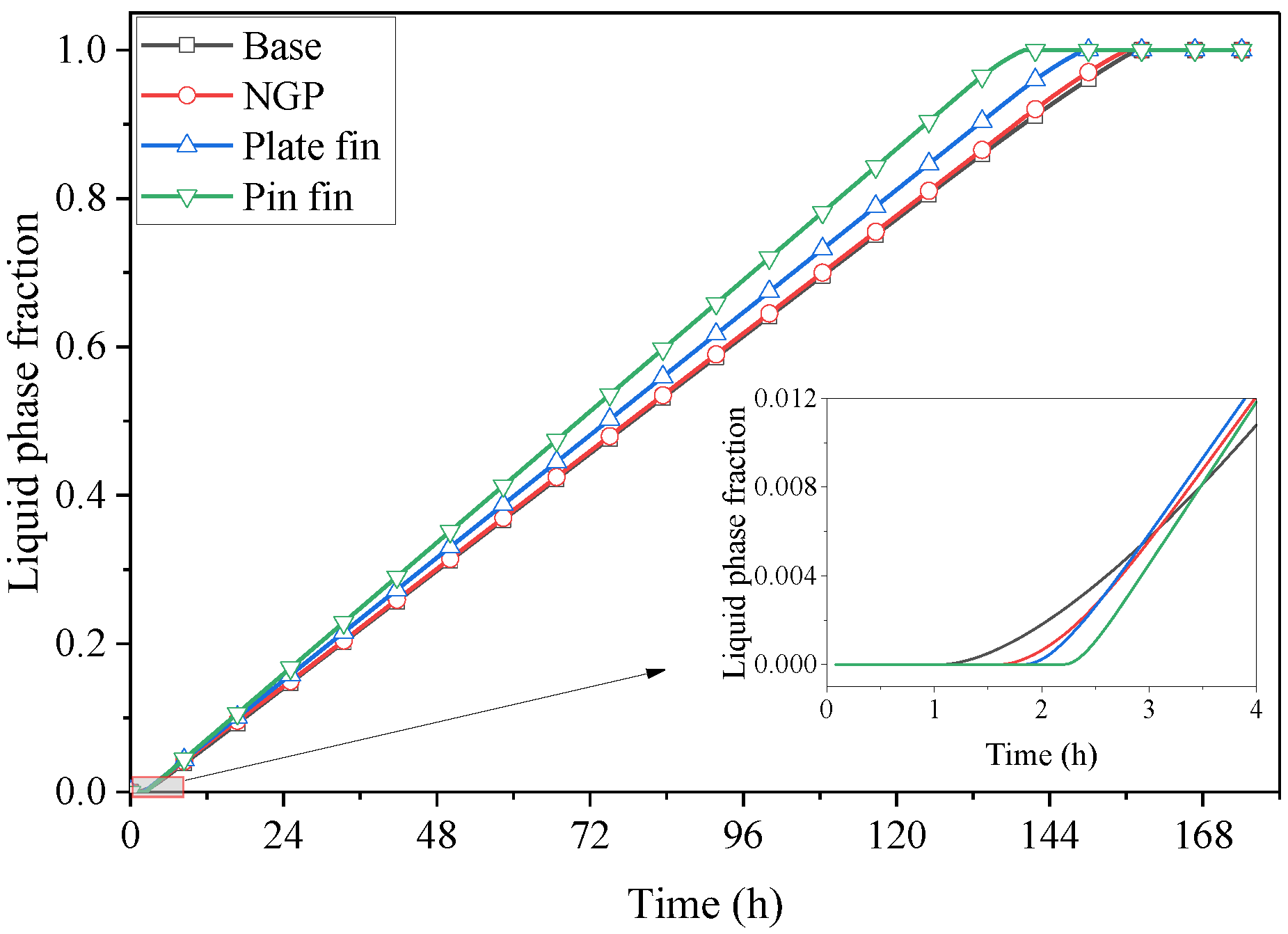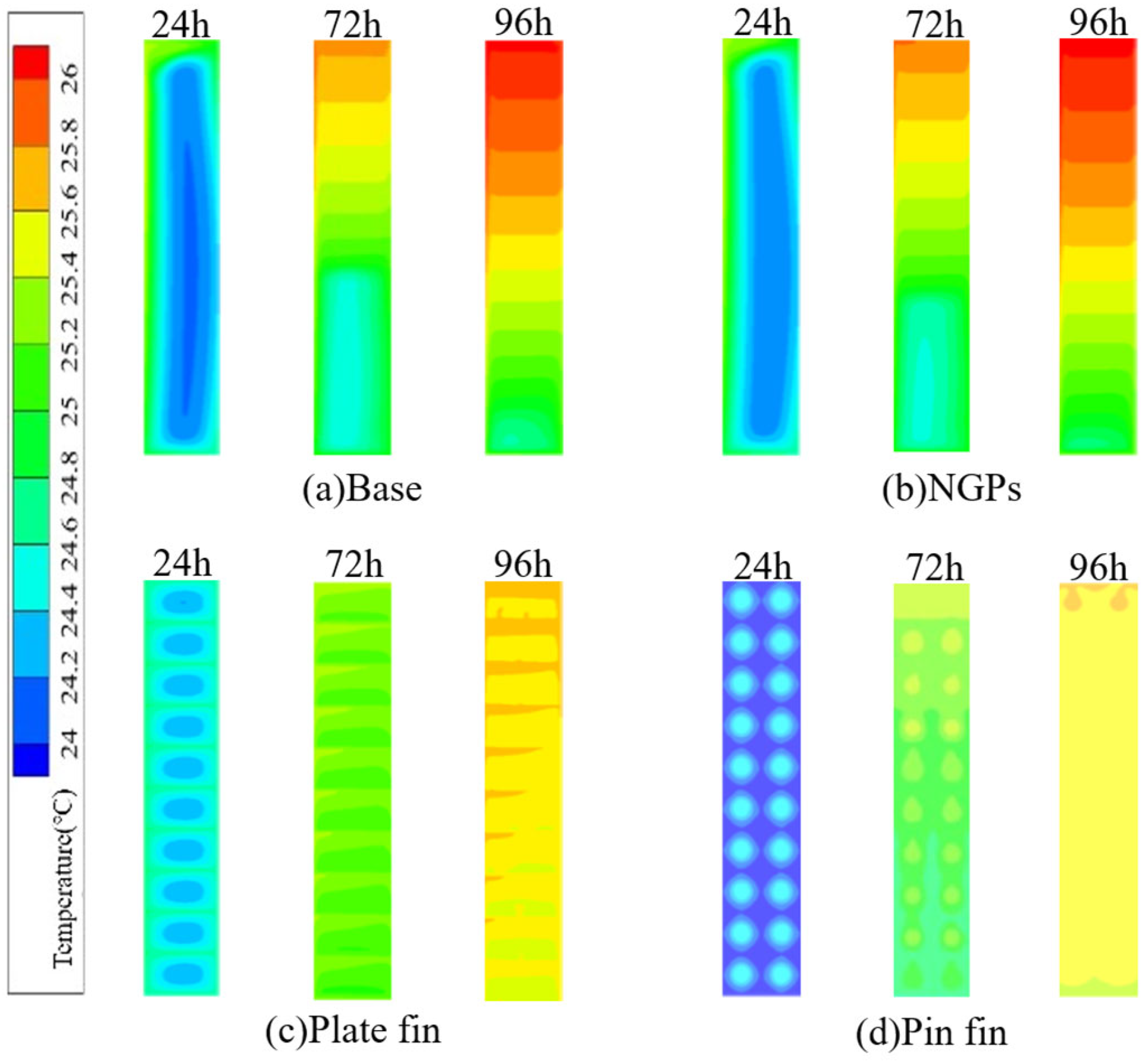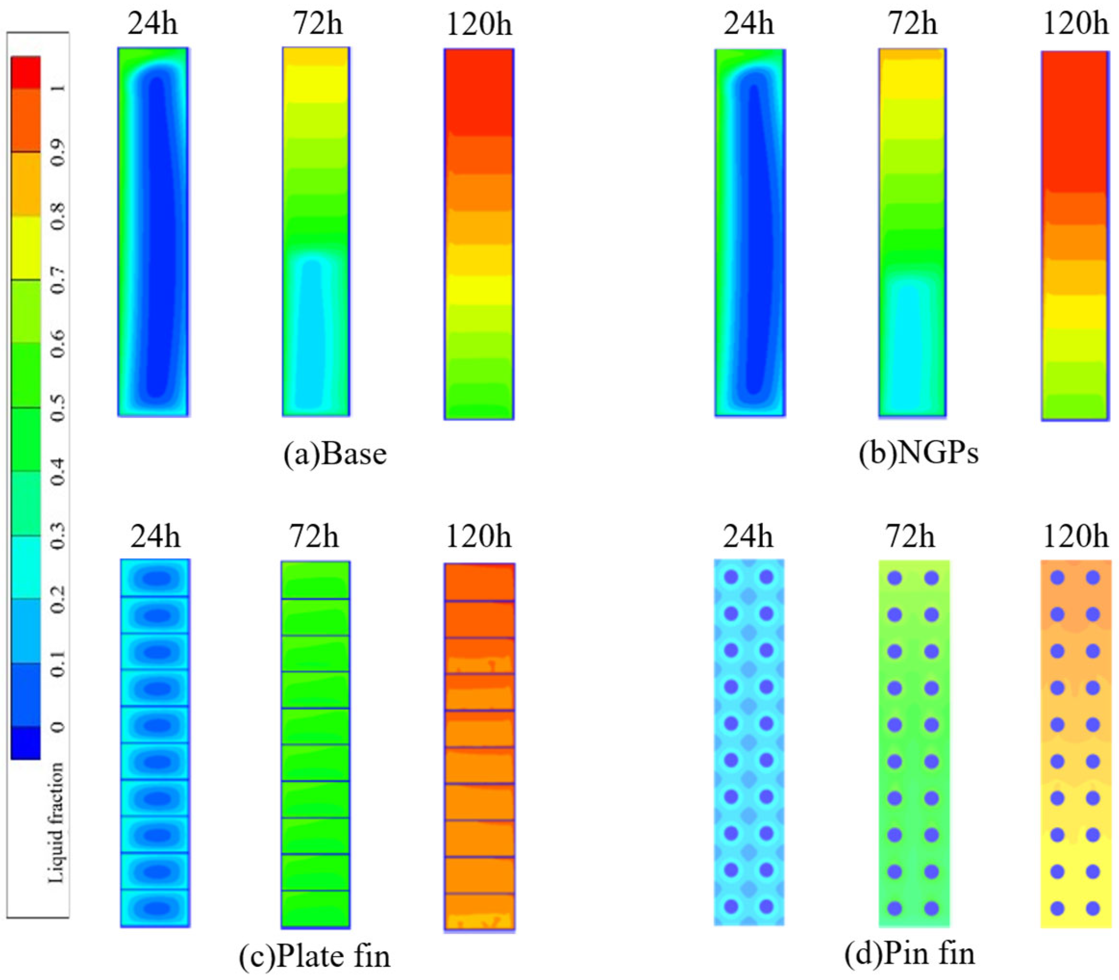 - Enhancement techniques profoundly impact the phase transition behavior of PCMs. The base PCP liquid fraction and temperature distribution demonstrate marked stratification. NGPs foster consistent melting within the PCM, whereas plate fins and pin fins augment melting rates and promote a more even temperature distribution.