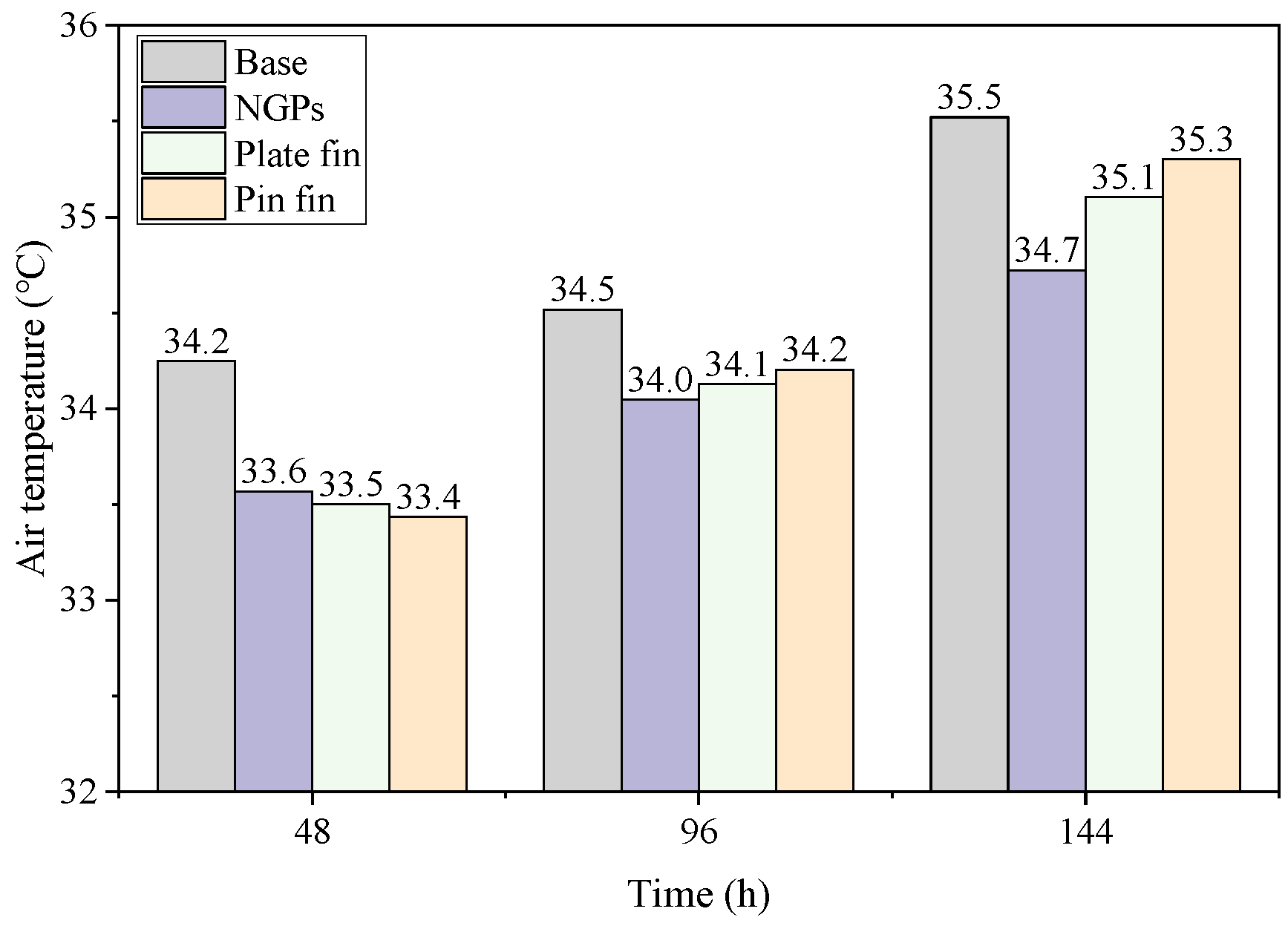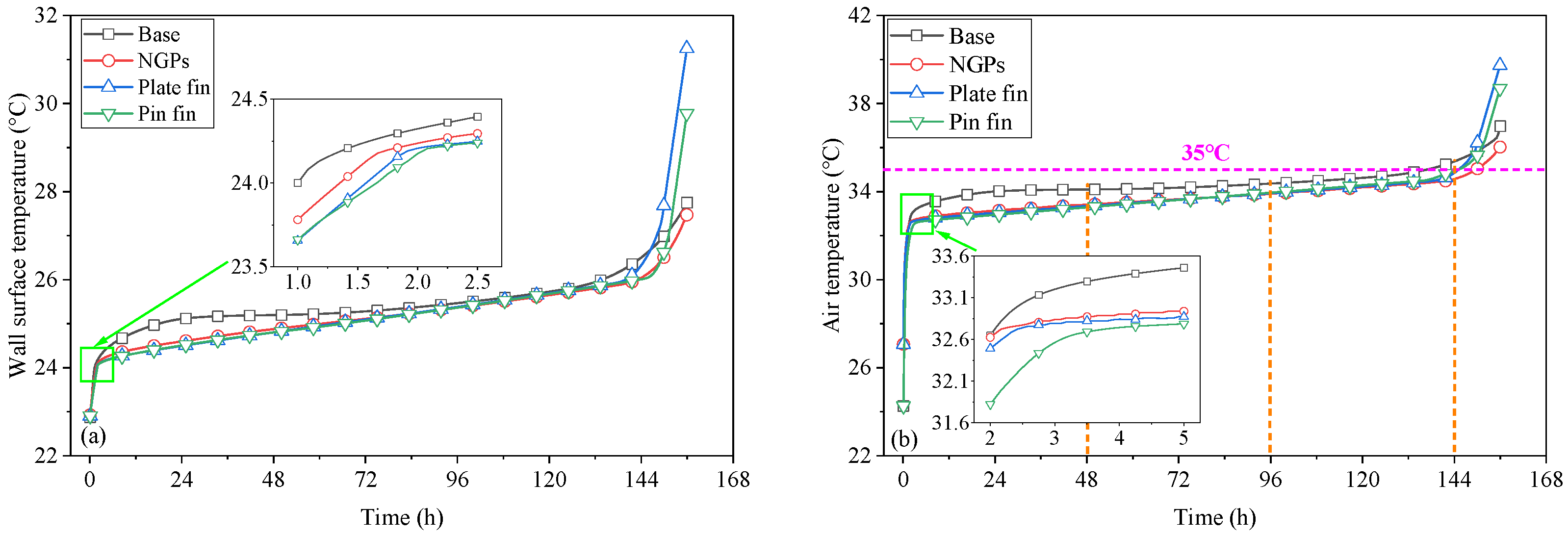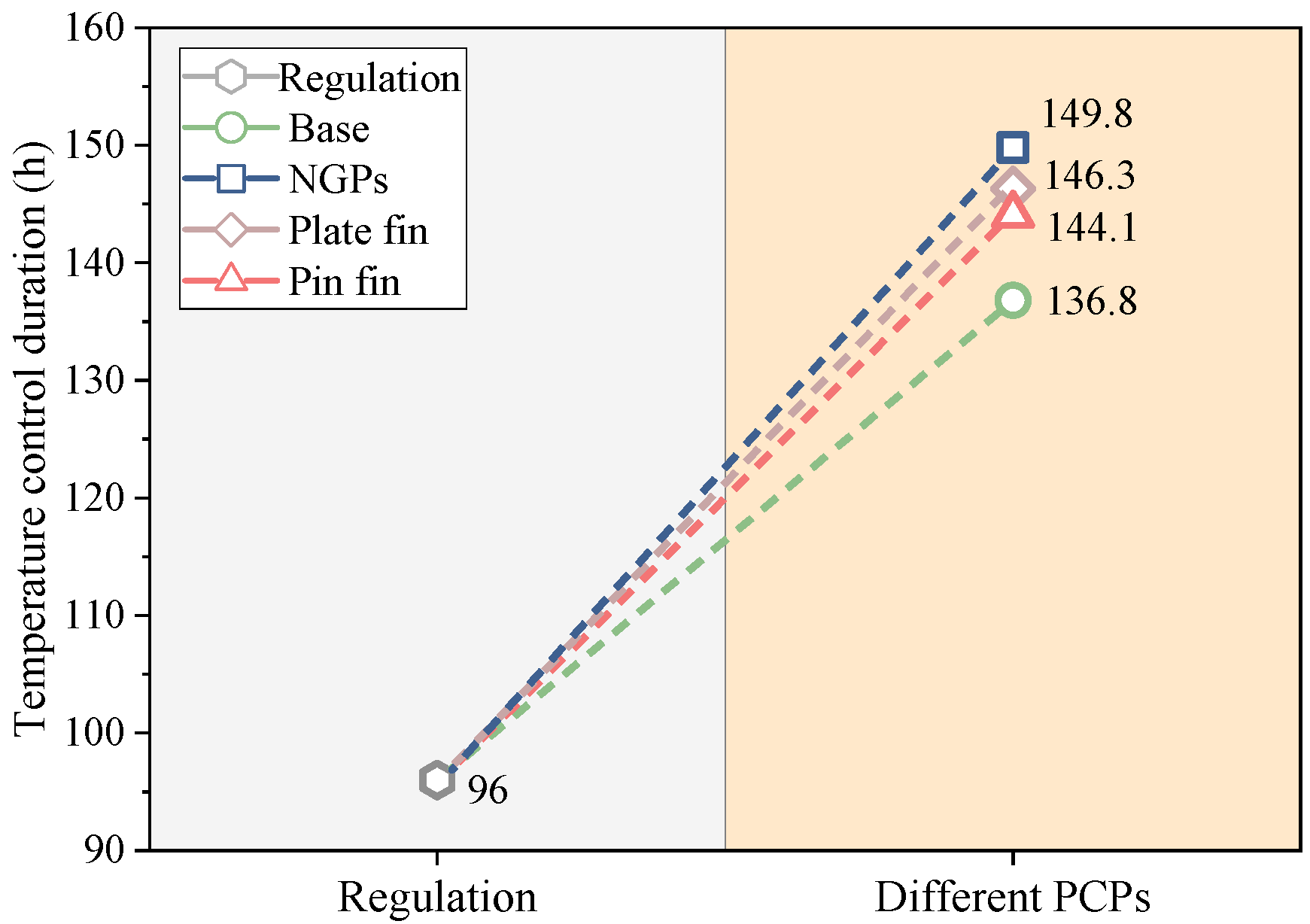 - In extended operation, the NGP structure demonstrates the best overall performance. Compared to the standard, the temperature drops by 1.64 °C at the 96th hour, and the temperature control period is prolonged by 53.8 h. In comparison with base PCP, the average wall temperature is reduced by 0.66 °C, a reduction in the average air temperature of 0.69 °C and an extension in the temperature control duration of 13 h.
