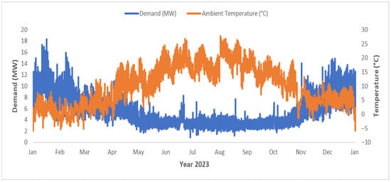 The reference year for this study is 2023, and AGS reports the heat demand from DH users from 00:00 on 1 January 2023 to 23:00 on 31 December 2023. The DH supplied to AGS by AGP is approximately 52 GWh/year. The heat demand profile depends on the season: it peaks in winter, due to massive space heating needs, and sees the lowest values in the summer months. This trend is also closely related to the ambient temperature; the hourly temperature measurement in Riva del Garda in Figure 3 proves this statement. The maximum heat demand value is found as 18.31 MWth in the middle of January.