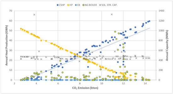 Total CO2 emission values and technological distribution of the total heat production of the non-dominated solutions of the 120th generation with installed thermal storage capacity of Type C—use case 2.