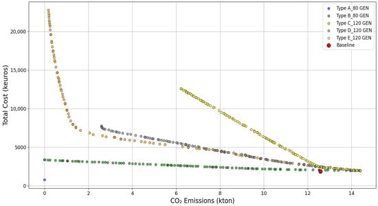Moreover, Figure 9 compares the final-generation Pareto fronts of Types A–E for the first use case, with CO2 emissions on the x-axis and total cost on the y-axis. The Pareto front evolves from a single non-dominated solution in Type A to 100 in later types. Types A and B achieve zero emissions, with ‘A’ offering the lowest cost but representing a complex and risky case, while B provides more practical, cost-effective options. Type C shows steep cost increases for emissions below 2 kton, approaching but not completely reaching zero emissions, whereas D and E offer optimal solutions only at medium-high emissions due to stringent constraints that have excluded many effective decision variables. Similar trends were observed in the second and third use cases.