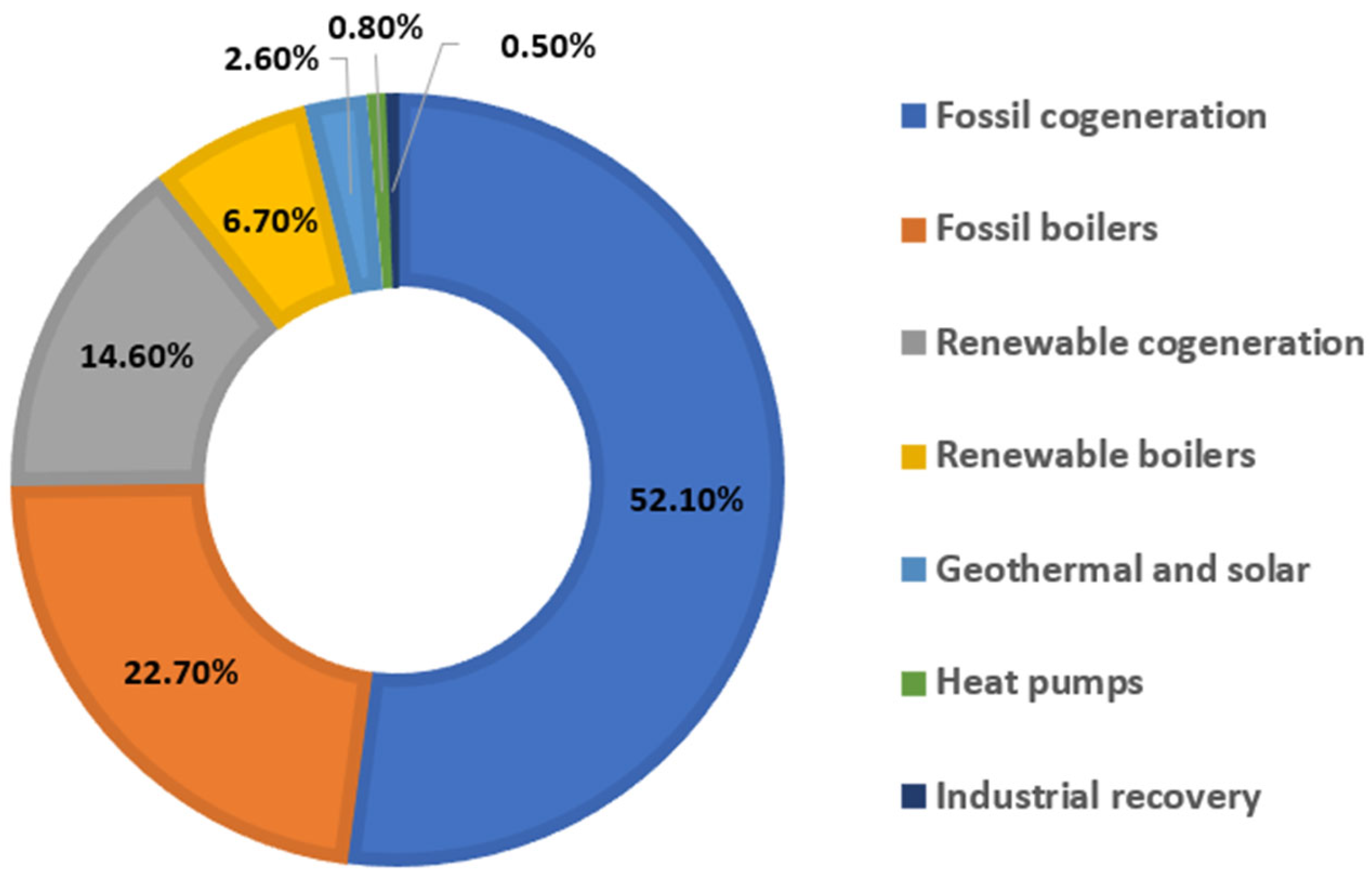 Figure 2 shows in detail the energy mix fed into the district heating networks. Geothermal, solar, heat pumps, and industrial waste heat recovery remain marginal, at 3.9% overall, while a major contribution is from fossil fuel-operated cogeneration plants [