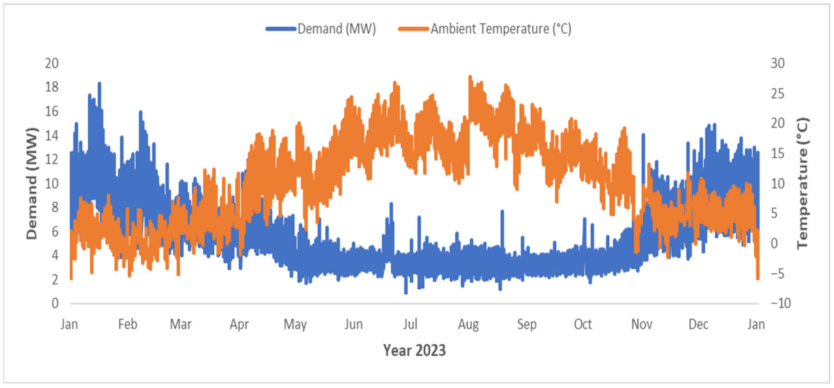 The reference year for this study is 2023, and AGS reports the heat demand from DH users from 00:00 on 1 January 2023 to 23:00 on 31 December 2023. The DH supplied to AGS by AGP is approximately 52 GWh/year. The heat demand profile depends on the season: it peaks in winter, due to massive space heating needs, and sees the lowest values in the summer months. This trend is also closely related to the ambient temperature; the hourly temperature measurement in Riva del Garda in