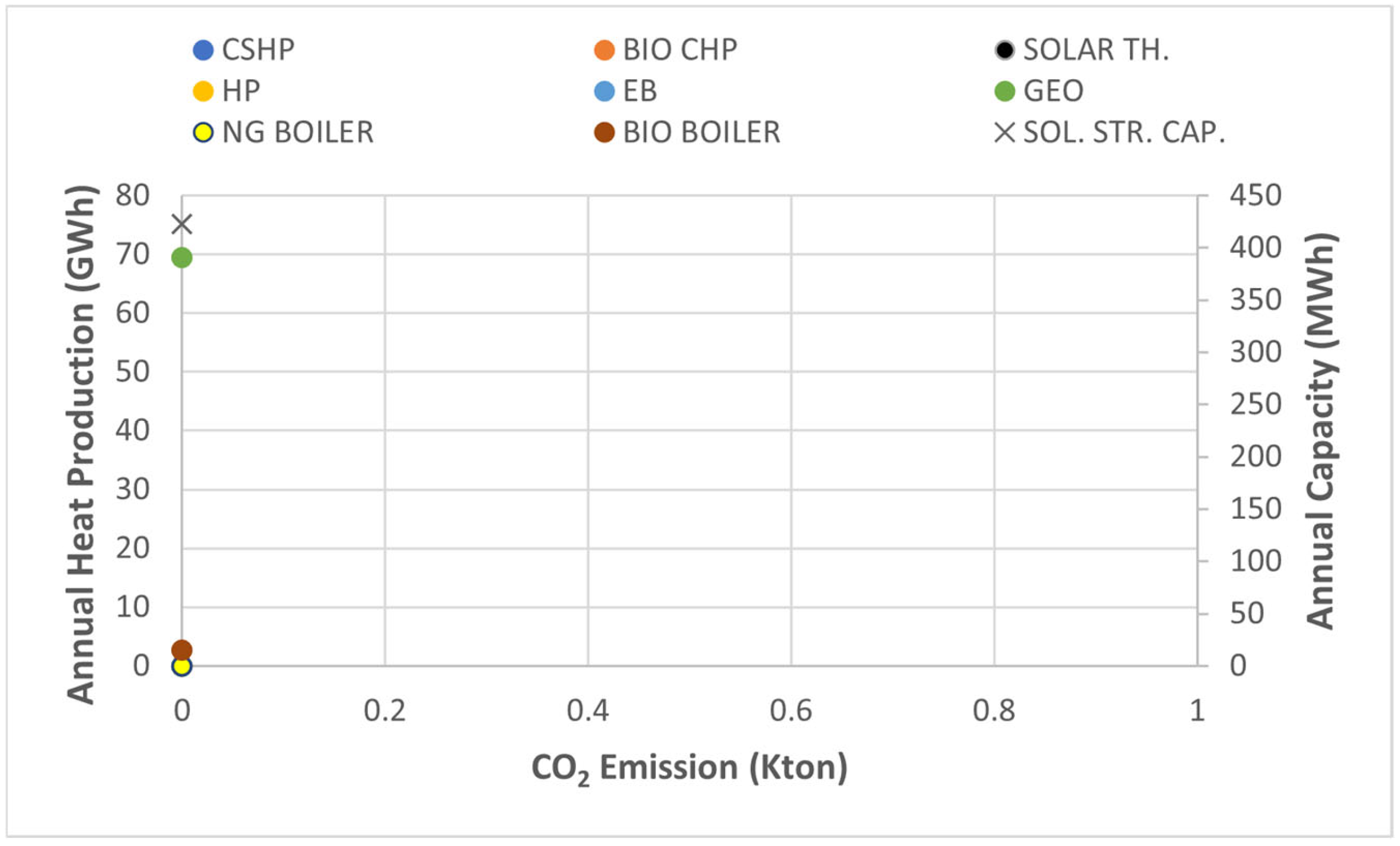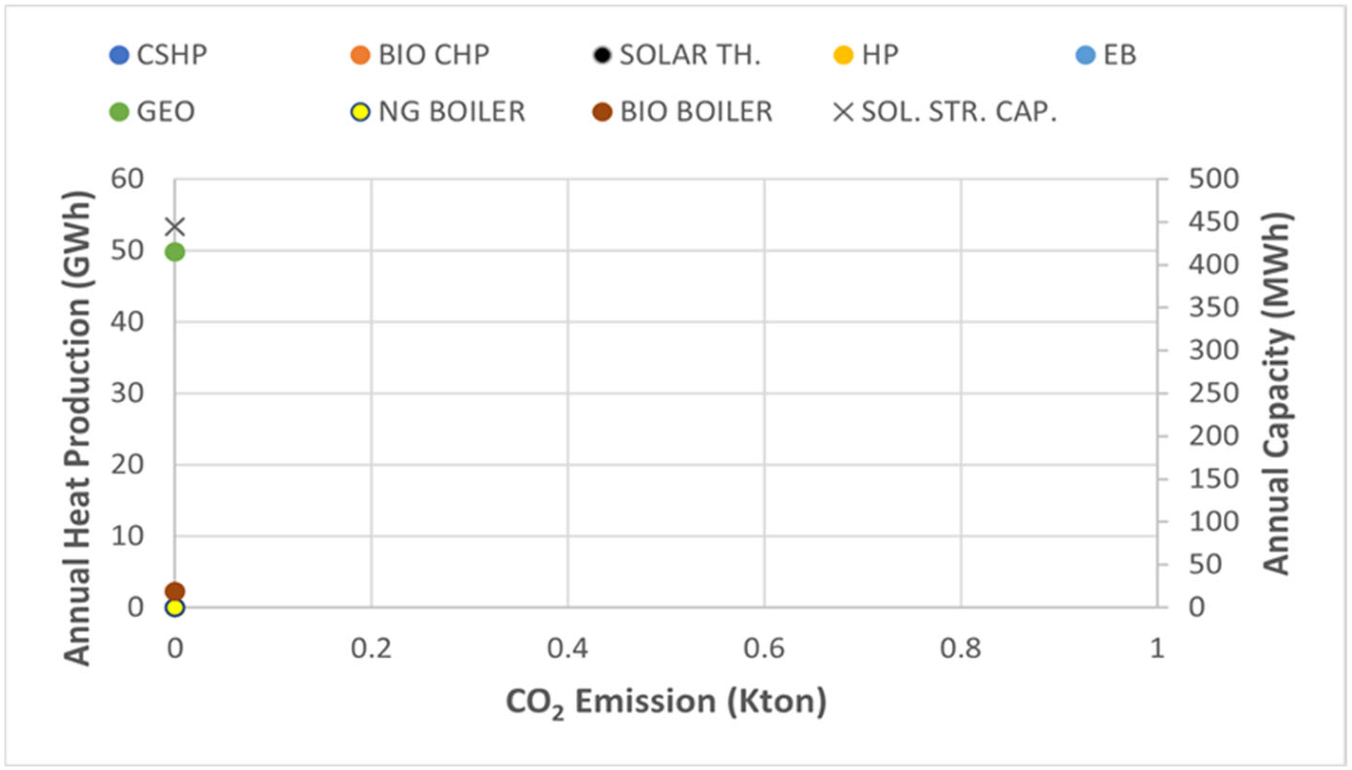 Figure 4, the optimal solution relied exclusively on renewable technologies—primarily a large deep geothermal cogeneration plant (GEO) supplying most of the district heating (49.79 GWh/year), a small biomass boiler (BIO BOILER) covering about 4% of the demand (2.22 GWh/year) with annual maximum capacity of 8.562 MW