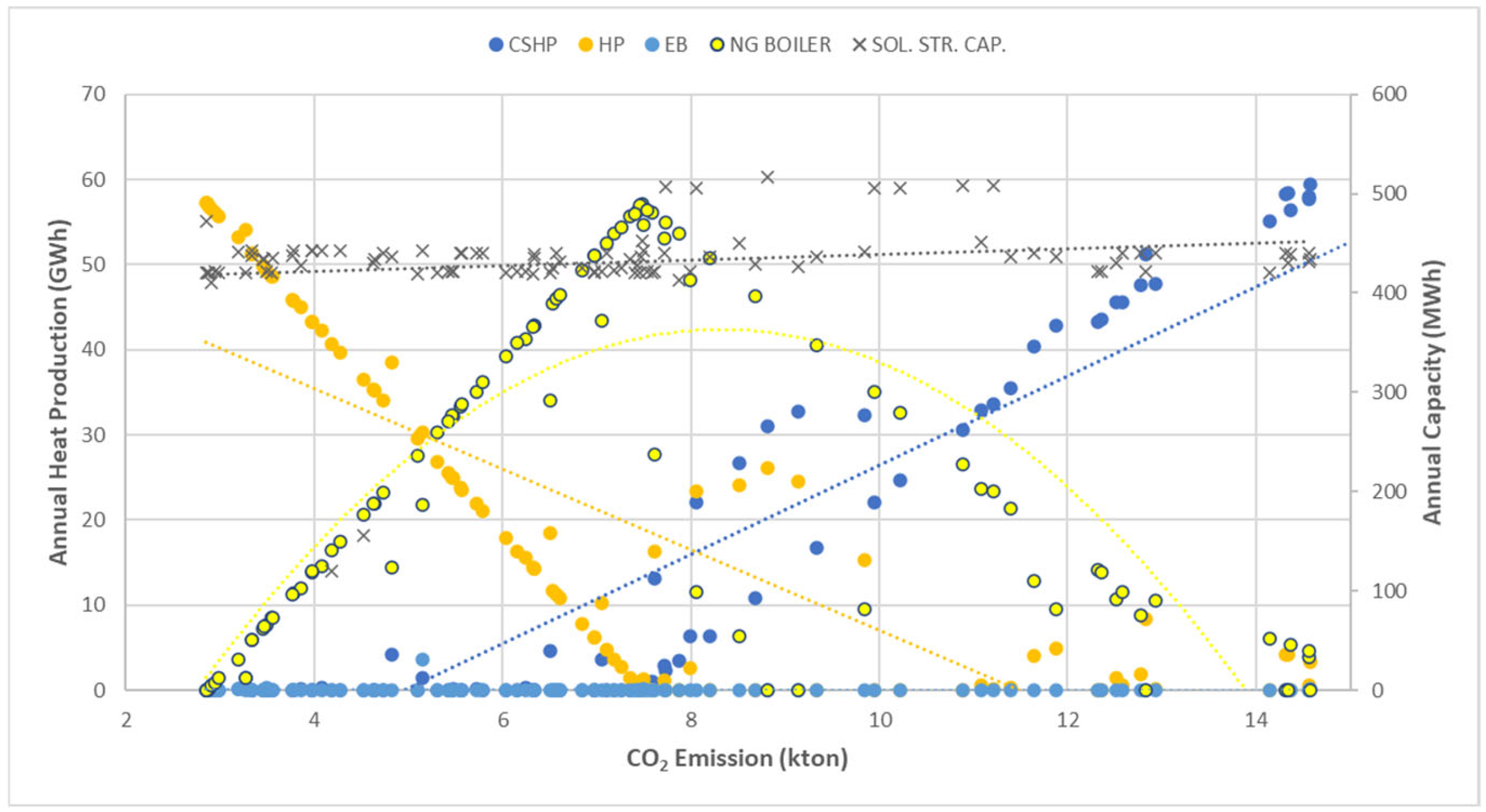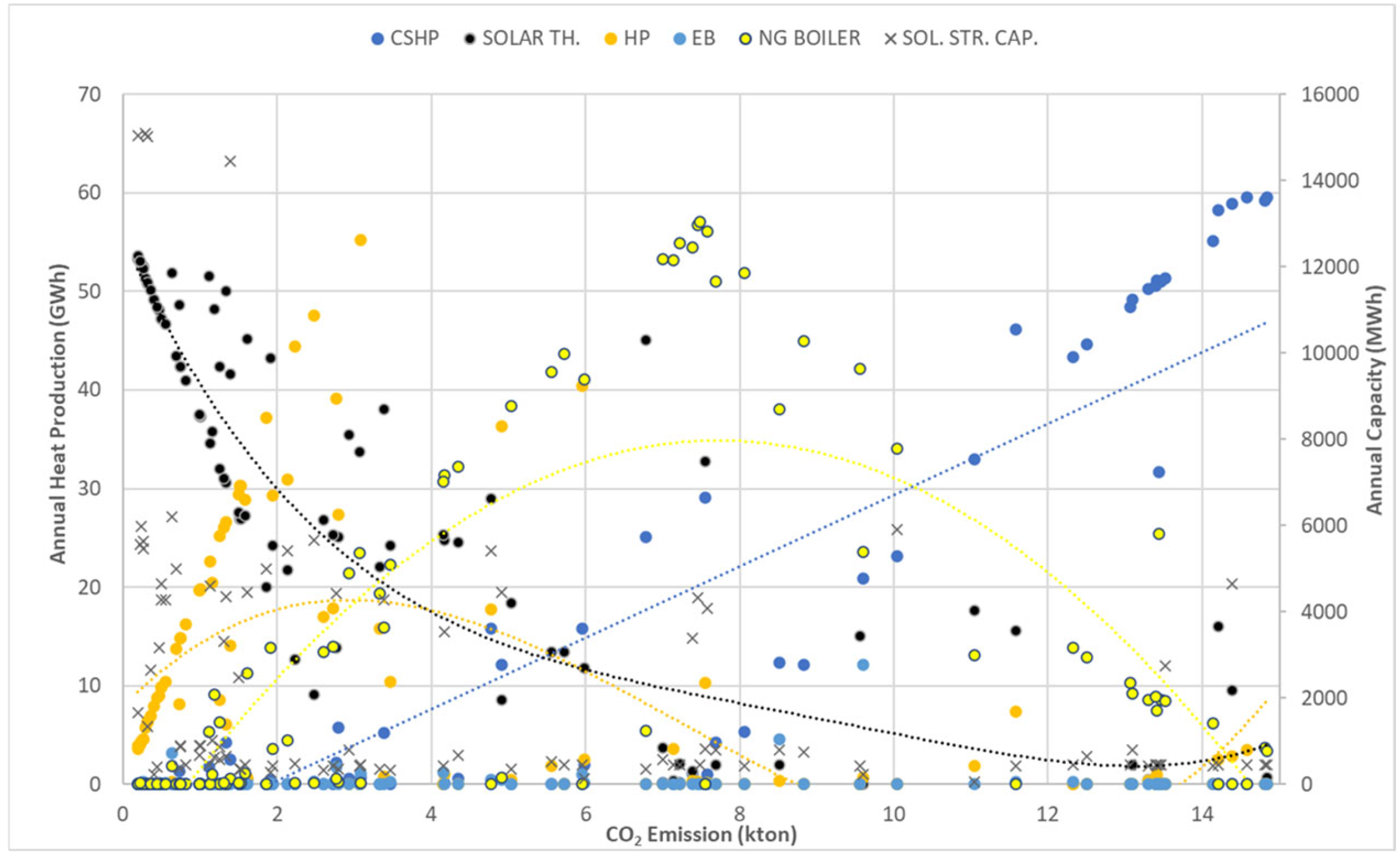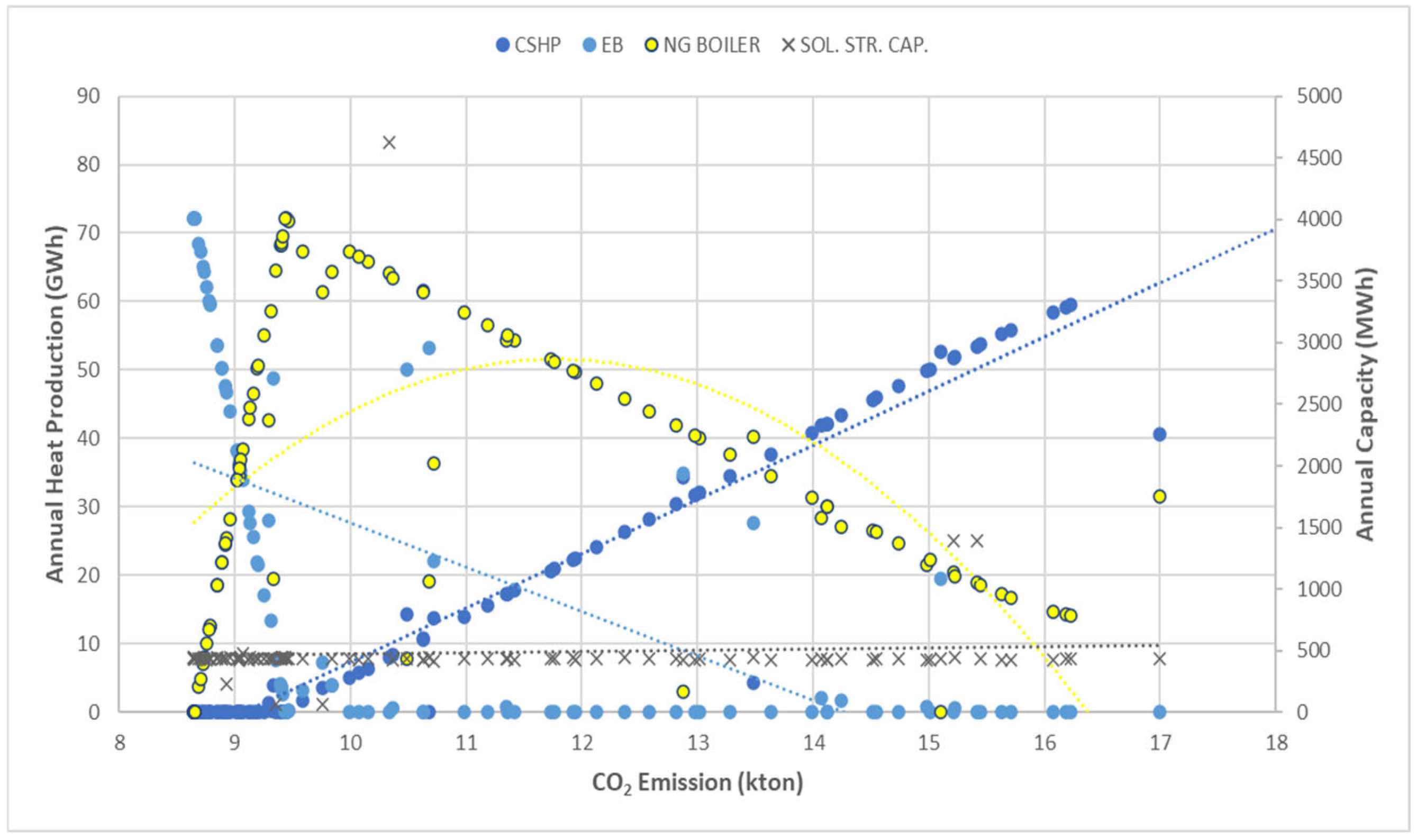 2 emissions but incurred higher total annual costs due to higher investment and operational costs, whereas solutions dominated by waste heat had higher emissions but lower costs. Seasonal thermal storage, with an average capacity of approximately 442 MWh, complemented the system by storing excess heat for peak demand periods. Contributions from the natural gas boiler were generally low, ranging between 0 and 49.98 GWh/year, and became more significant only in solutions with higher emissions.