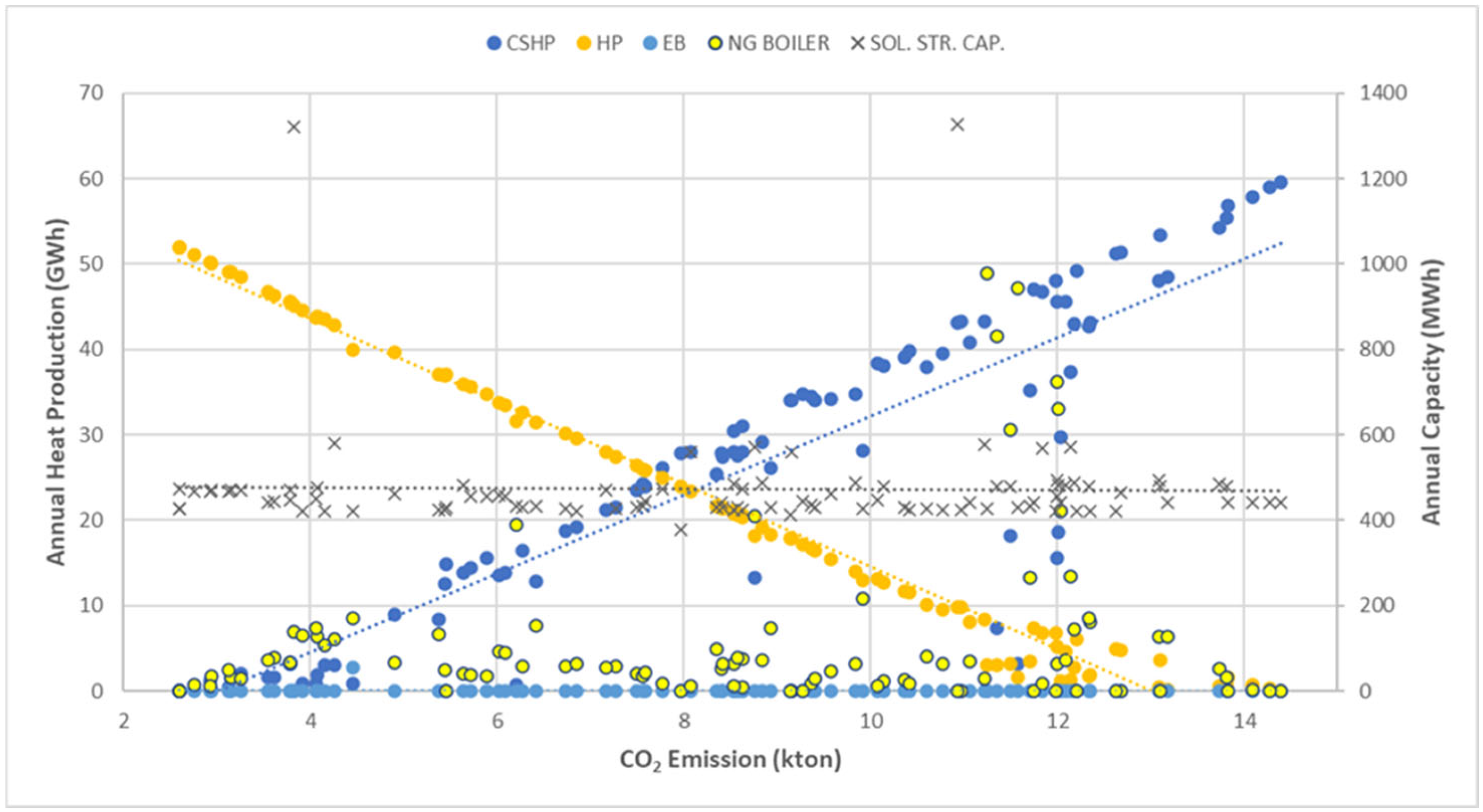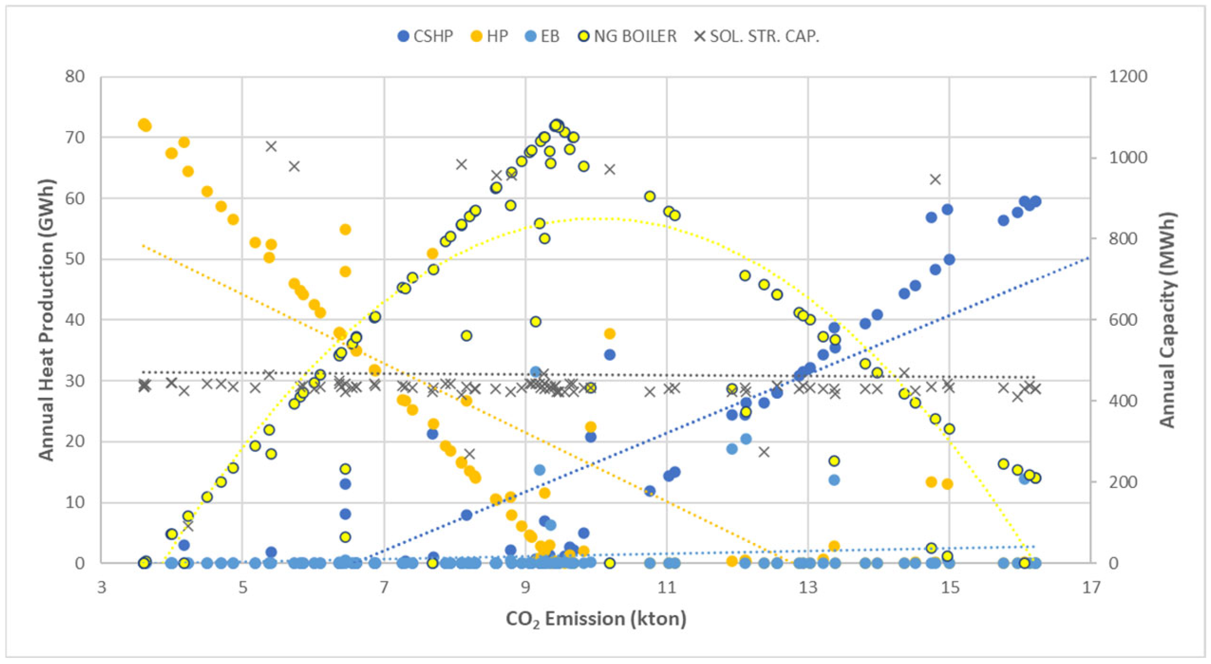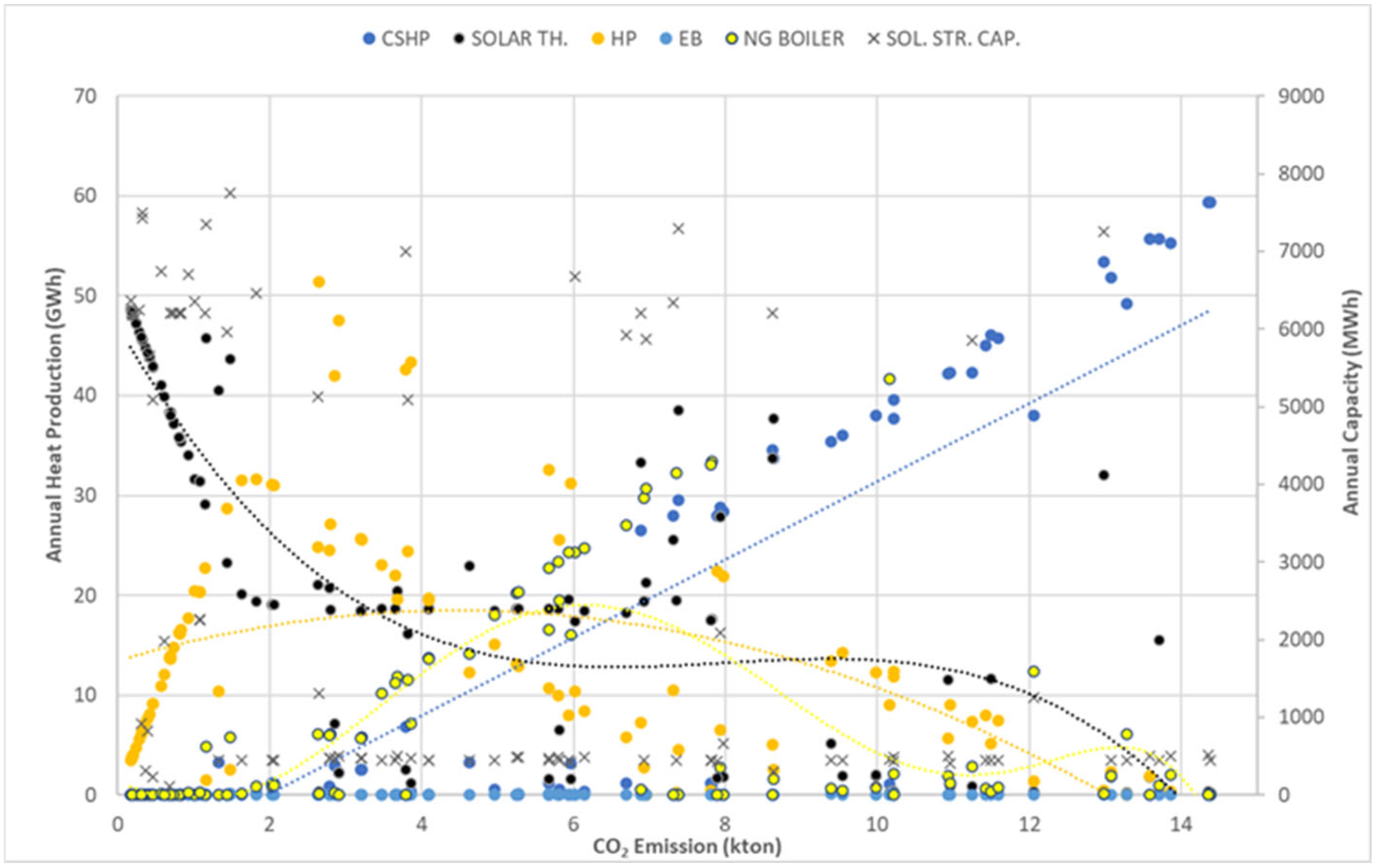 2 emissions but incurred higher total annual costs due to higher investment and operational costs, whereas solutions dominated by waste heat had higher emissions but lower costs. Seasonal thermal storage, with an average capacity of approximately 442 MWh, complemented the system by storing excess heat for peak demand periods. Contributions from the natural gas boiler were generally low, ranging between 0 and 49.98 GWh/year, and became more significant only in solutions with higher emissions.