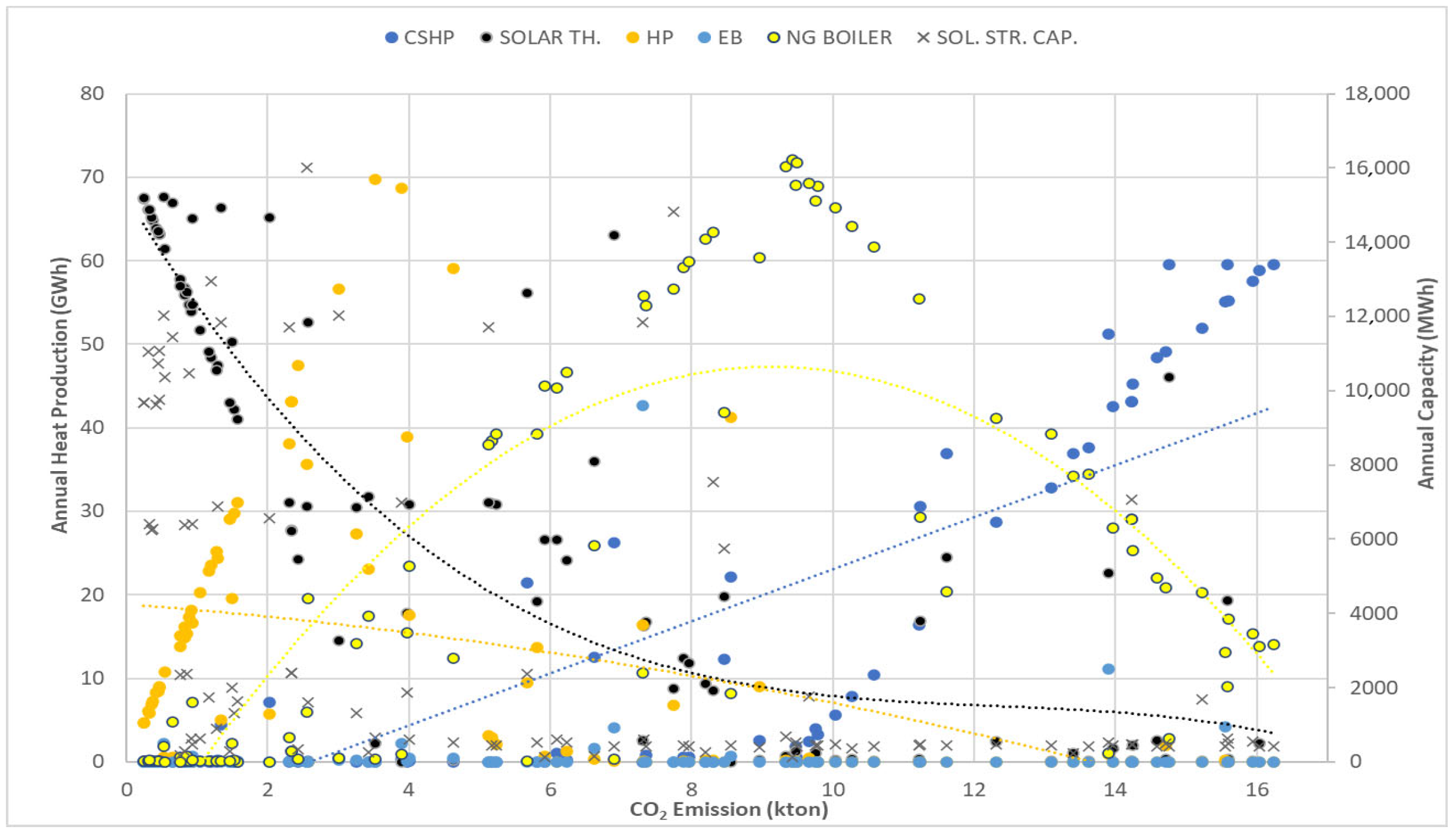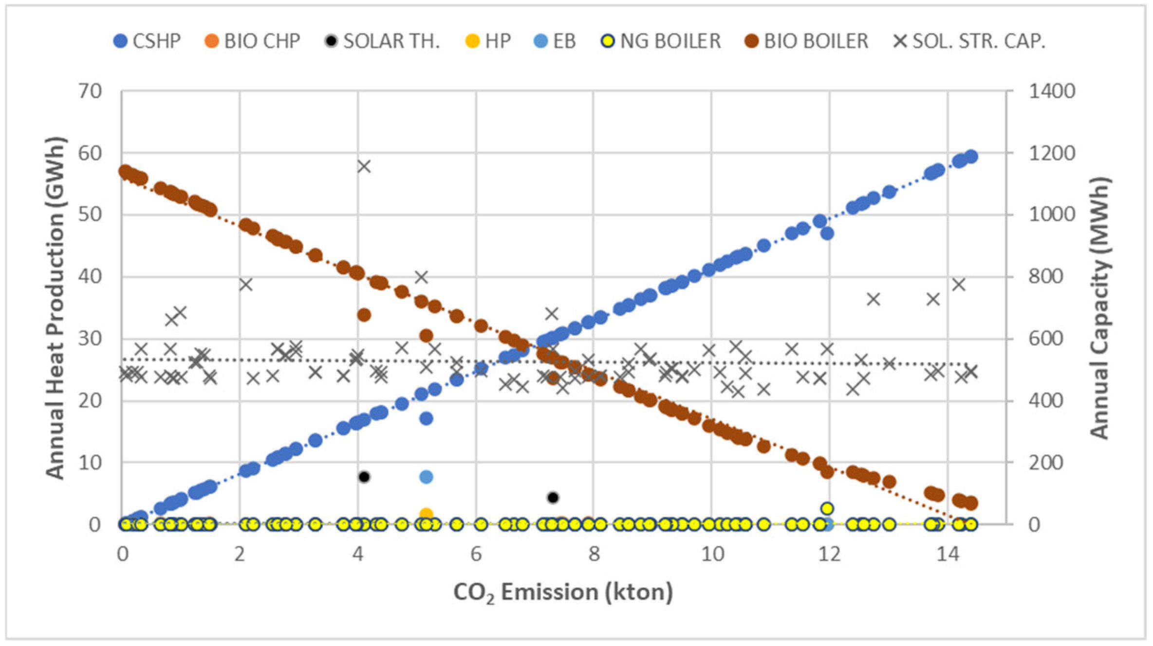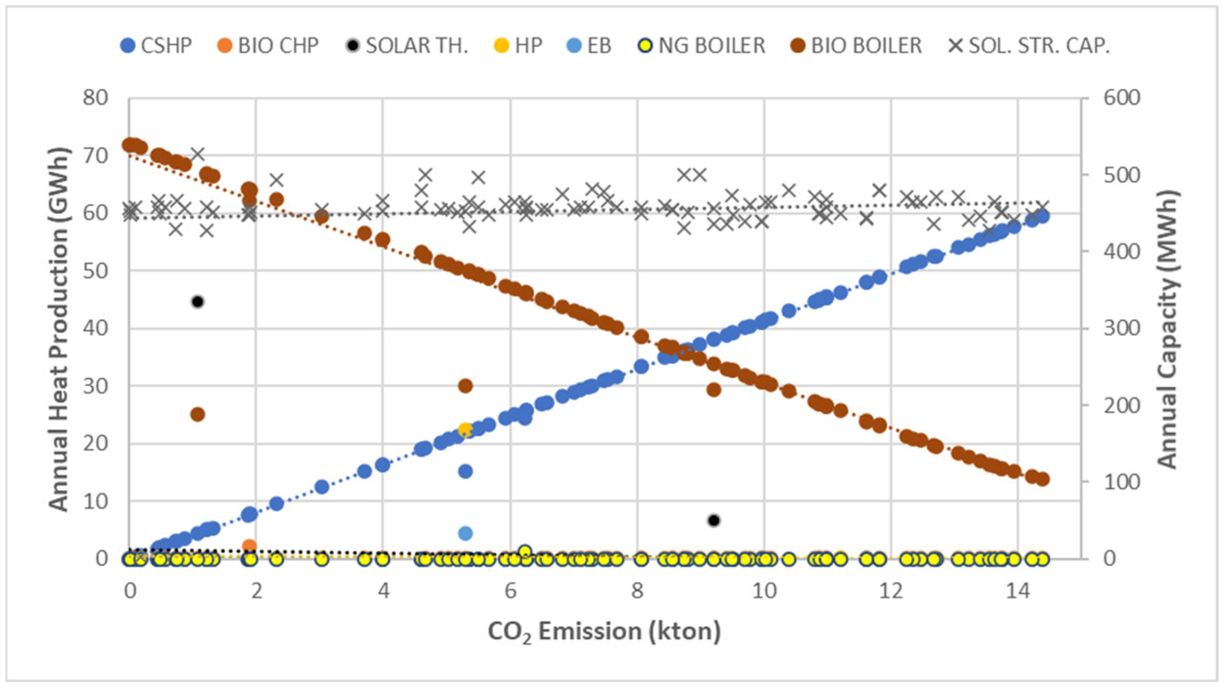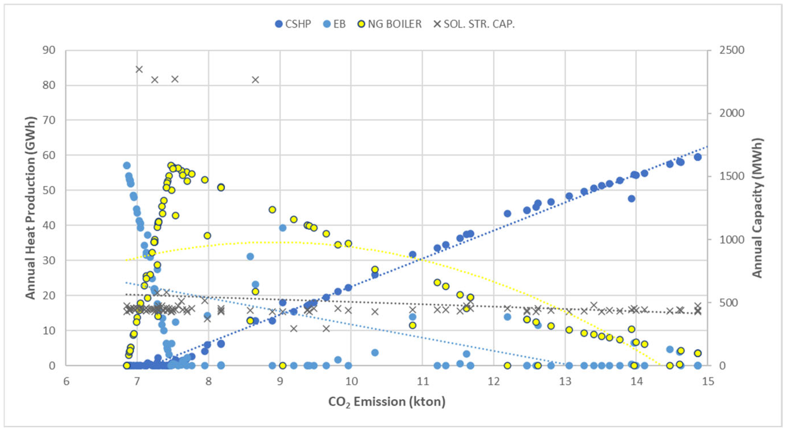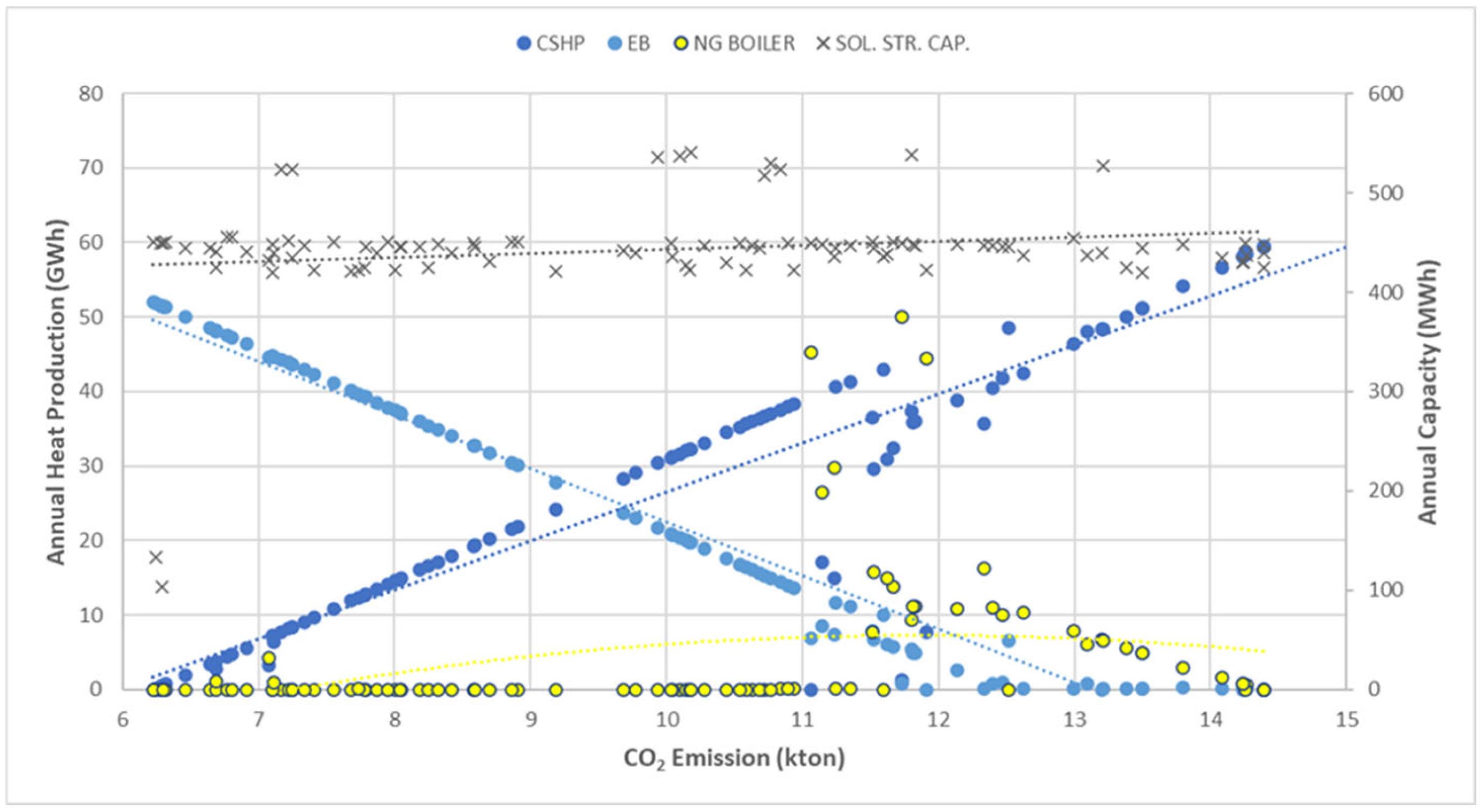 Figure 8. Solutions with a higher share of electric boiler production achieved lower CO