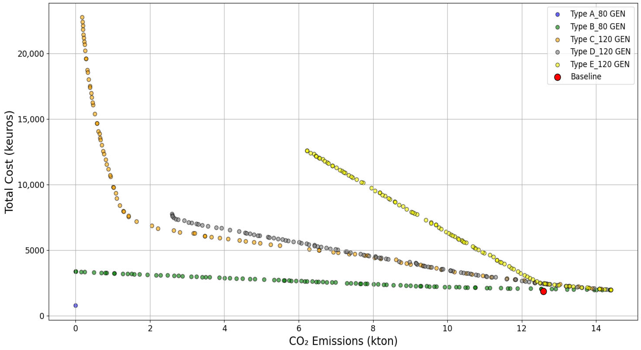 Each baseline was then optimized using an MOEA to minimize both CO2 emissions and annual costs. A total of 9 decision variables were assessed under defined boundary conditions to generate alternative future scenarios grouped into 5 types (future decarbonization scenarios A–E), resulting in 8000–12,000 analyzed cases per type.