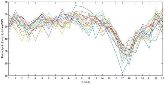 Chance-constrained programming and the scene method are two typical approaches of stochastic optimization []. The scene method mainly contains two aspects, scene generation and scene reduction. The solution to the targeted expectation is to regard the randomness of the stochastic variable as countless “scenes”. Specifically, a large number of scenes are first generated according to the probability distribution of the stochastic variable. Then, scenes with a low probability or high resemblance to other scenes are removed. For the limited scenes remaining after reduction, their expectations can be obtained with discussions. In this paper, stochastic optimization based on the scene method is adopted to handle the uncertainty of wind and photovoltaic powers.