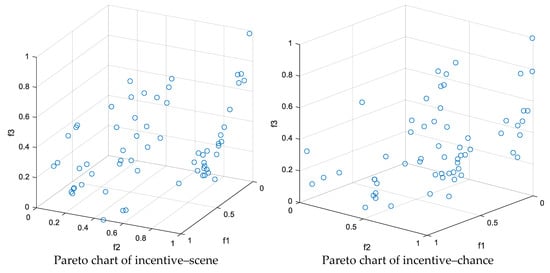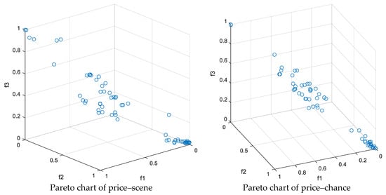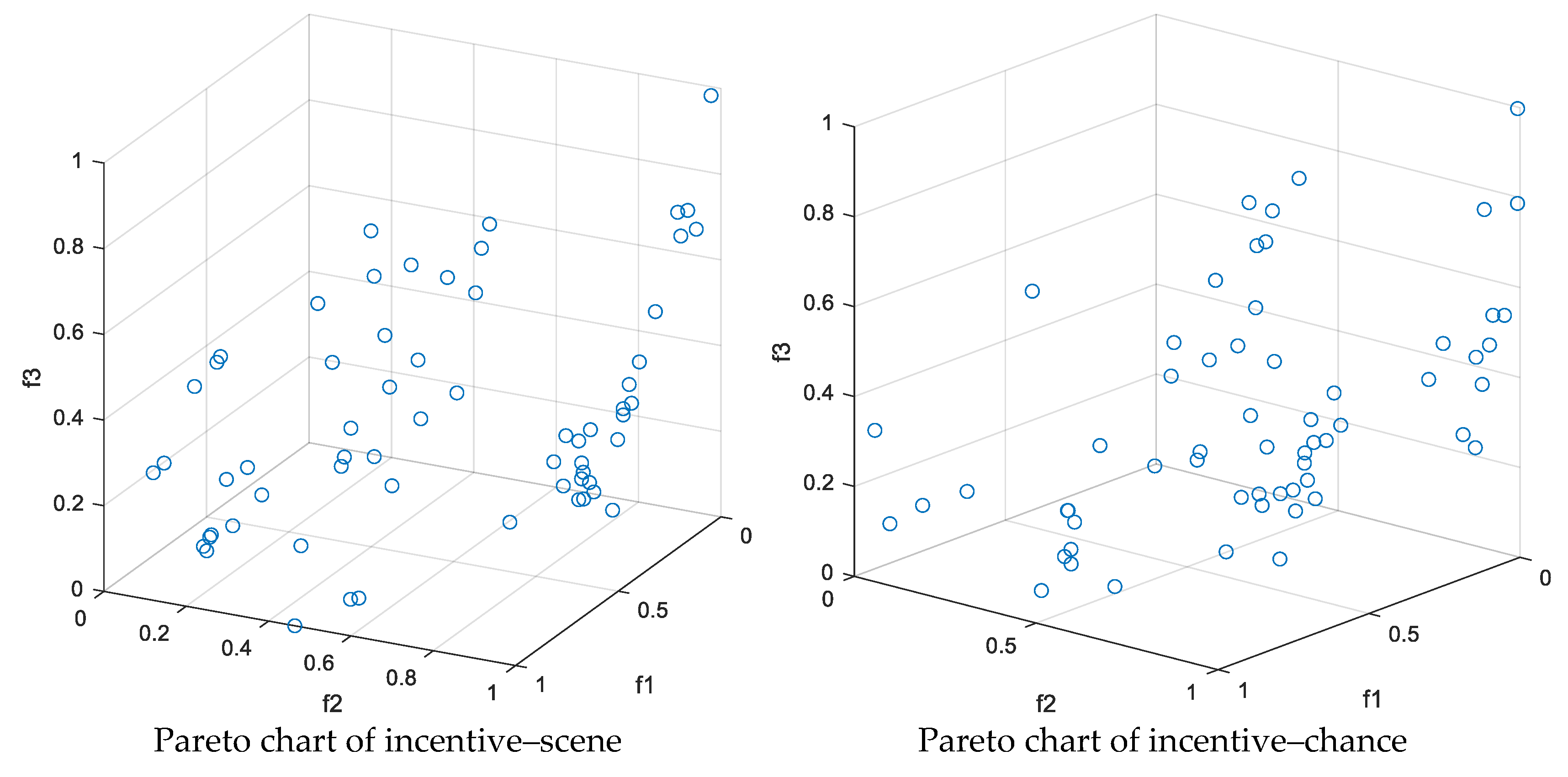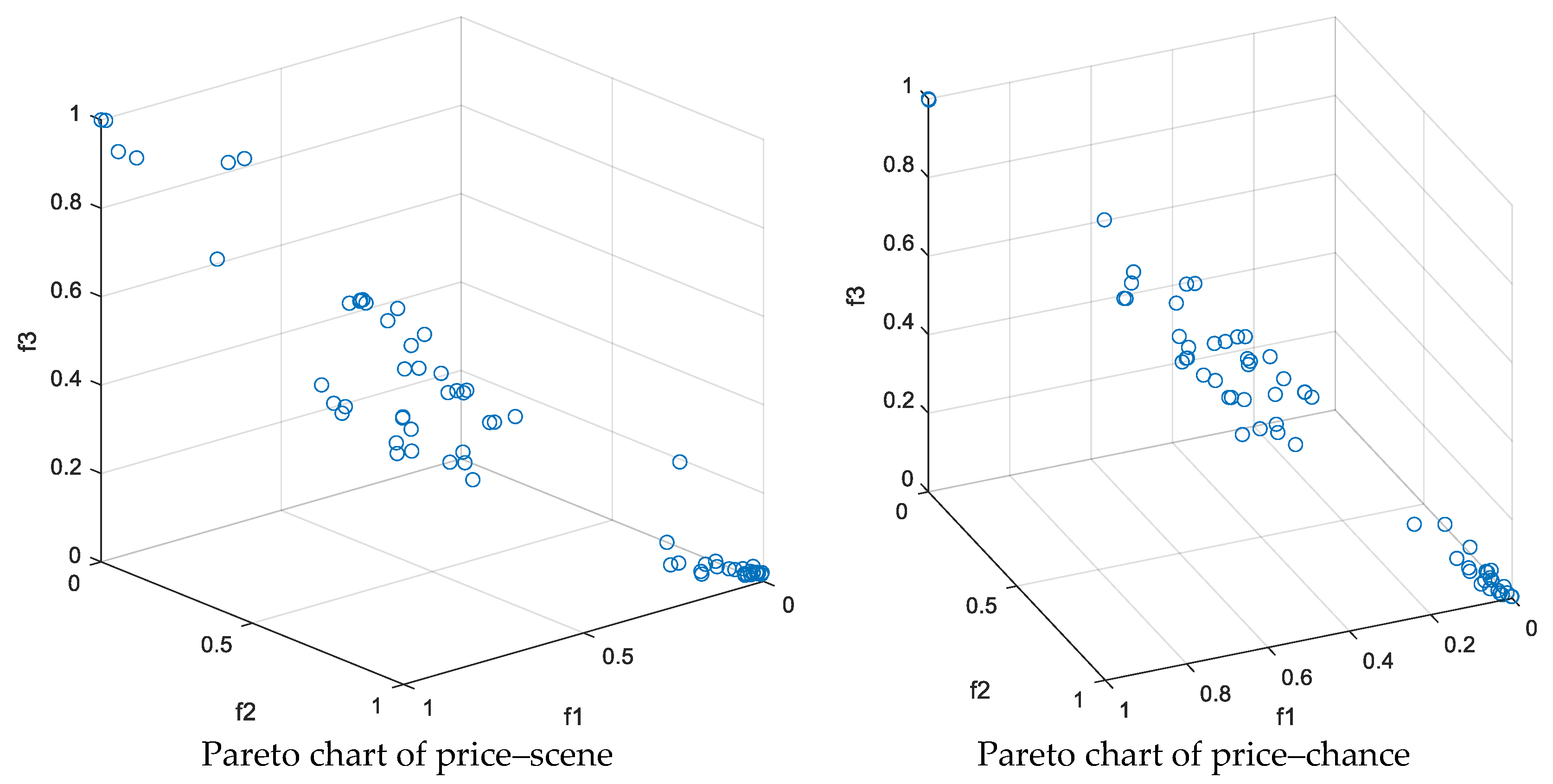 Depending on the random quantity handling and demand response method, the solutions can be categorized into four combinations: scene–incentive, chance–incentive, scene–price, and chance–price. The Pareto charts of each combination obtained after 100 iterations of the MOEA/D algorithm are shown below.