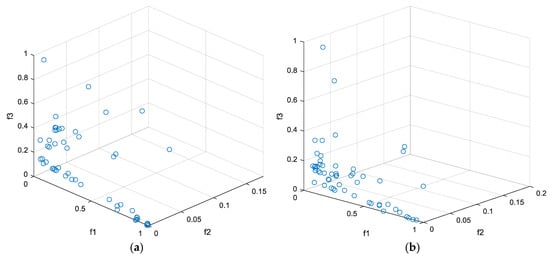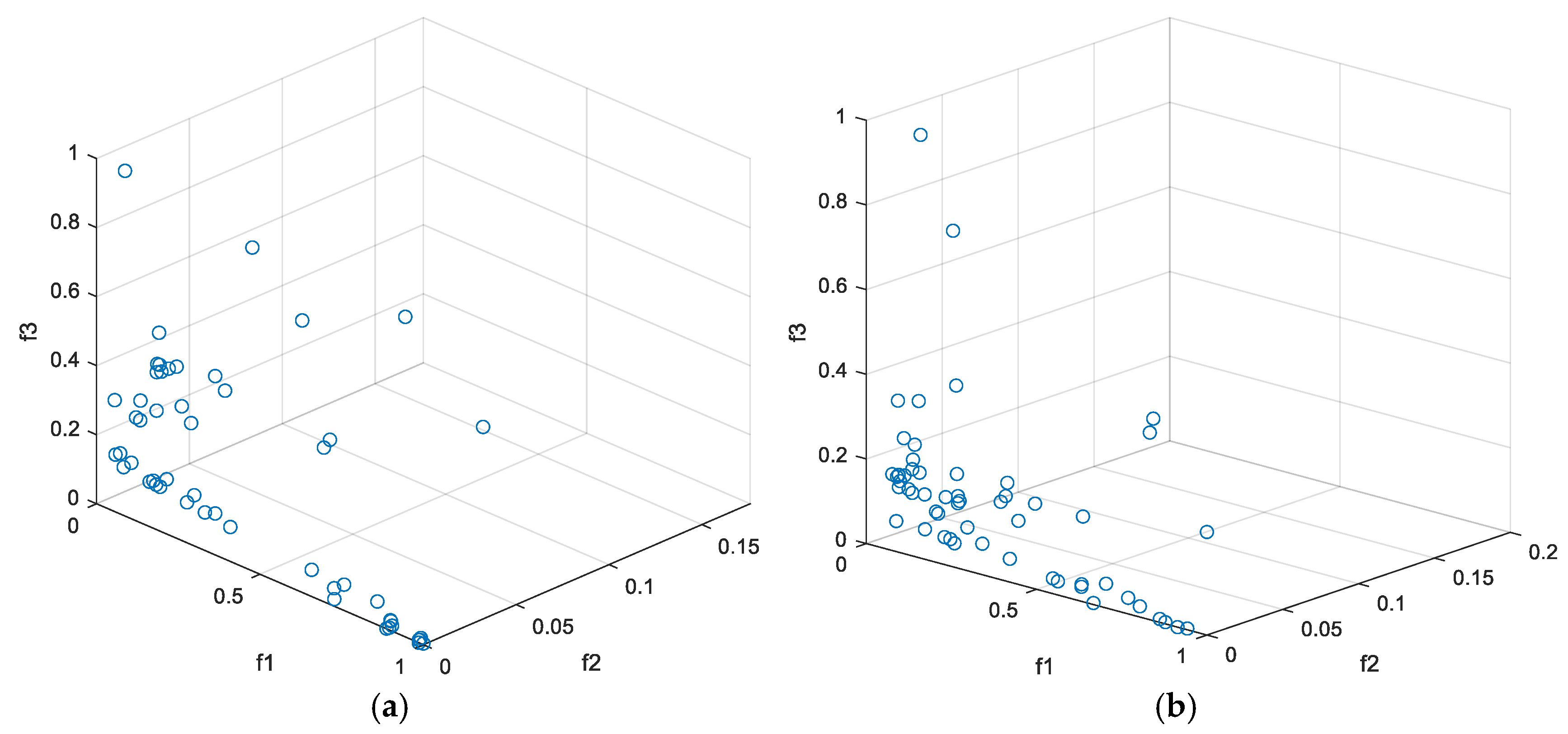 As can be seen from the figures and tables above, the Pareto surfaces obtained from the demand response based on price and incentive are different. Among the three objective functions, f3, the economy, is the most seriously influenced. Though the difference in the optimal values is small, the variation of the trade-off values is significant. This is due to the fact that the minimum is mostly determined by the lower limit of the output and the deprecation cost of the unit, while the maximum is determined by their respective functions.