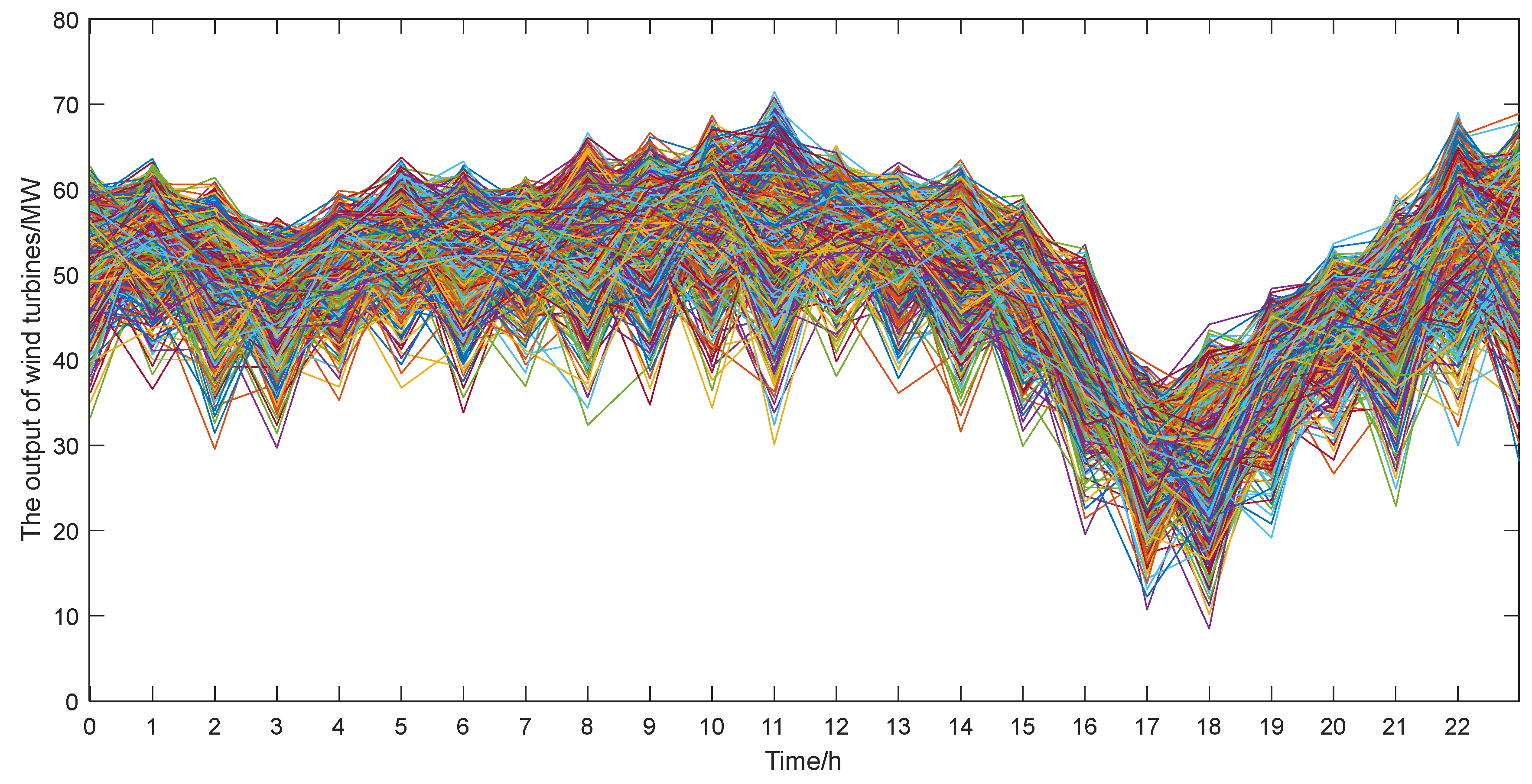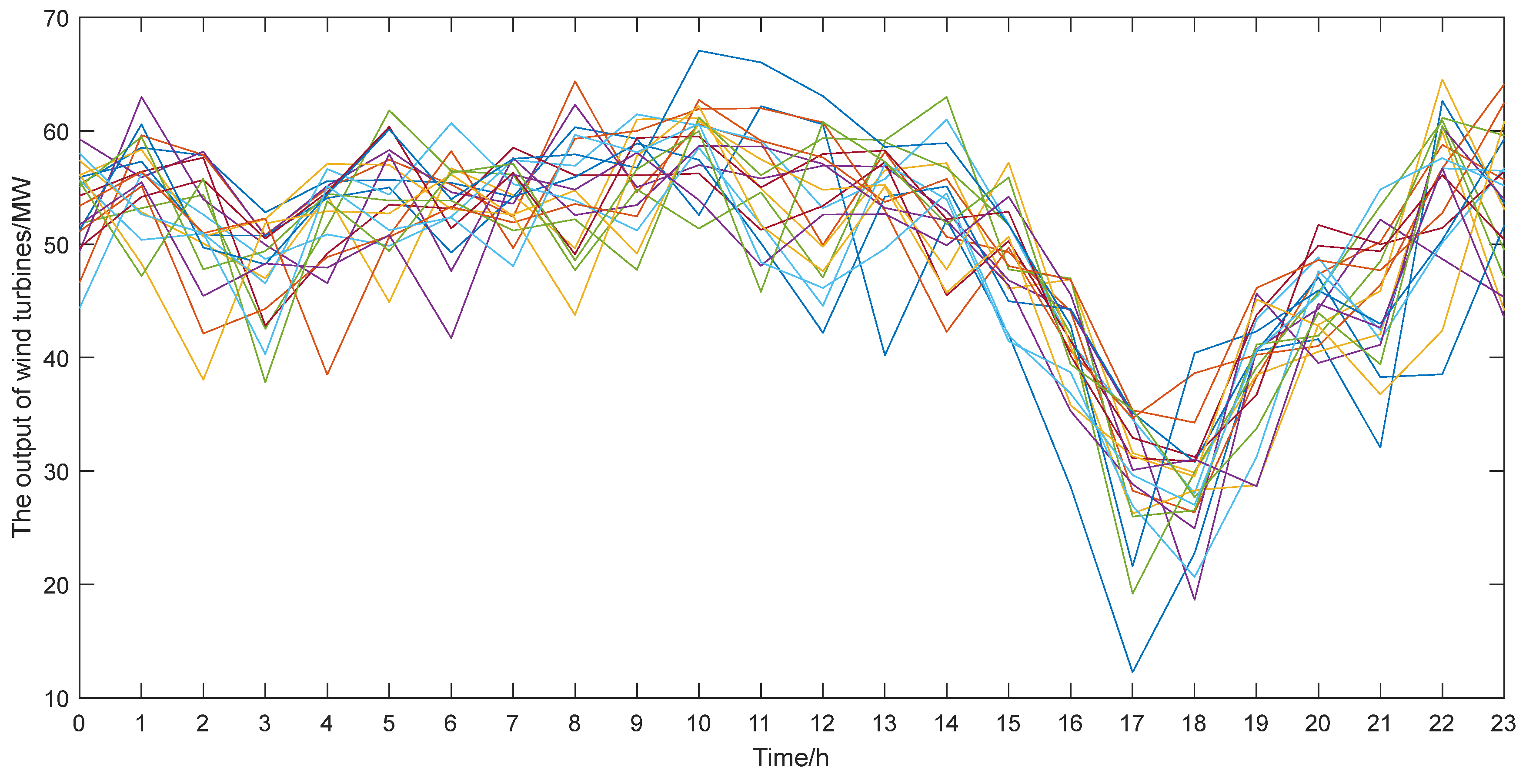 29]. The scene method mainly contains two aspects, scene generation and scene reduction. The solution to the targeted expectation is to regard the randomness of the stochastic variable as countless “scenes”. Specifically, a large number of scenes are first generated according to the probability distribution of the stochastic variable. Then, scenes with a low probability or high resemblance to other scenes are removed. For the limited scenes remaining after reduction, their expectations can be obtained with discussions. In this paper, stochastic optimization based on the scene method is adopted to handle the uncertainty of wind and photovoltaic powers.