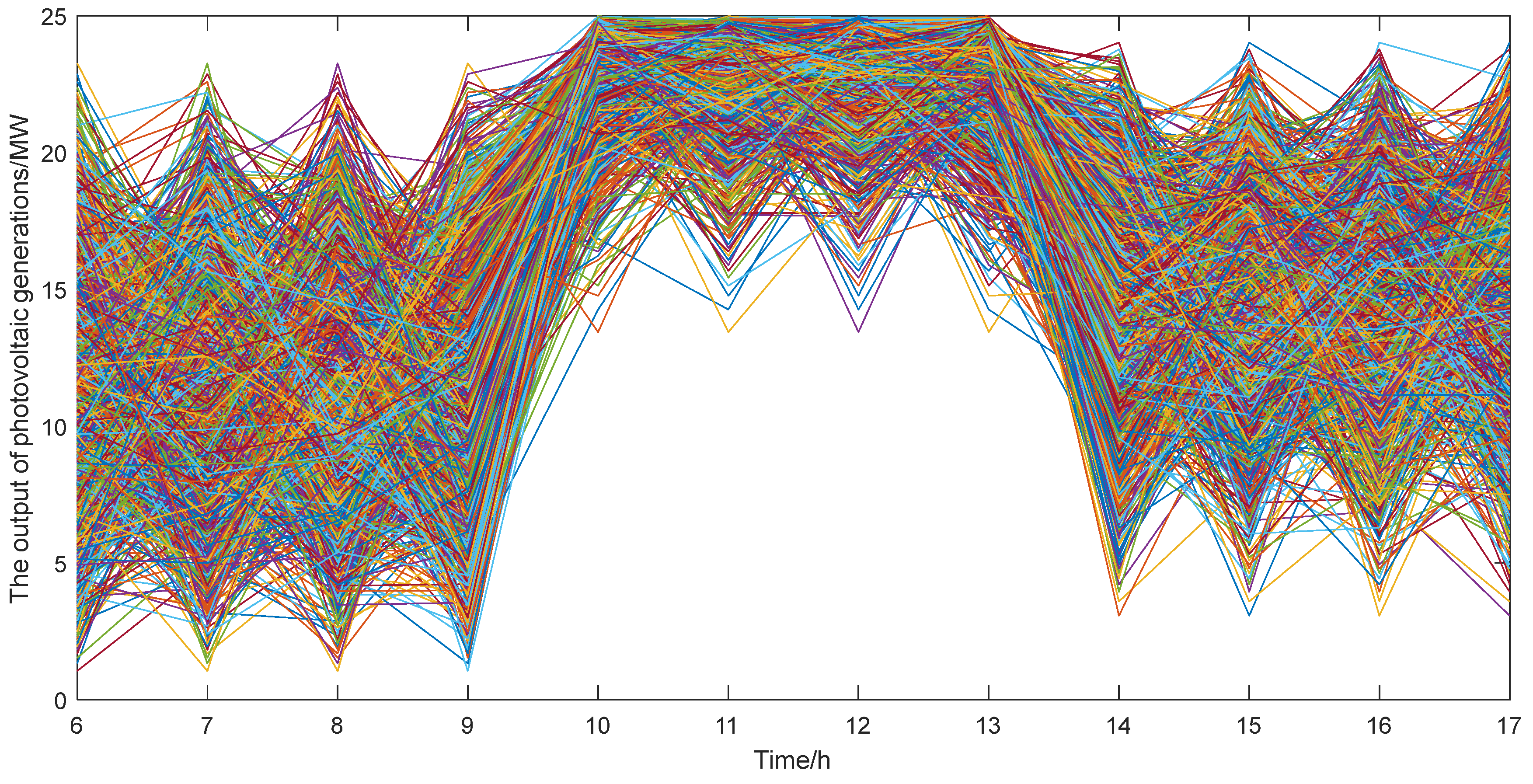 Certainly, the wind turbines and photovoltaic generators are at different locations on the power grid, and their powers exert varied influences on the power system. Therefore, it is impossible to simply put the stochastic variable scenes of multiple wind and photovoltaic outputs in cascade into integrated scenes and then perform reduction. The sequential combination method is the most widely applied at present, which separately reduces the scenes of several random variables and combines them into integrated scenes simply according to the default corresponding position. This method fails to consider all the possible combinations; if full consideration is required, similar to the scene tree method mentioned above, the integrated scenes obtained will include a large number of scenes, thus increasing the amount of computation.