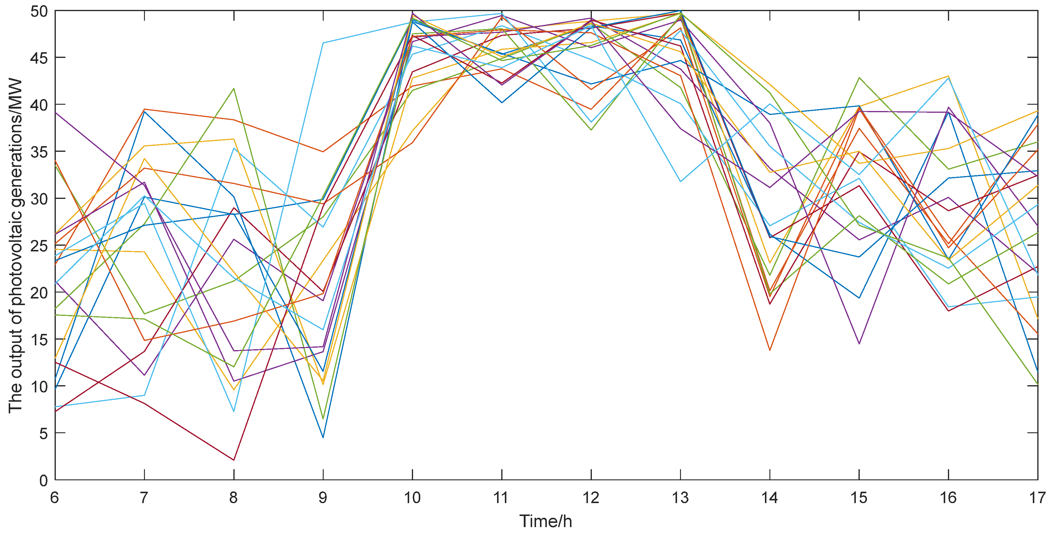 Considering that several periods are included in each day, each stochastic variable (wind or photovoltaic output) is expressed as a time sequence , where t represents the number of periods. The quasi-Monte Carlo (QMC) method is used to generate representative samples from the variable’s probability distribution.